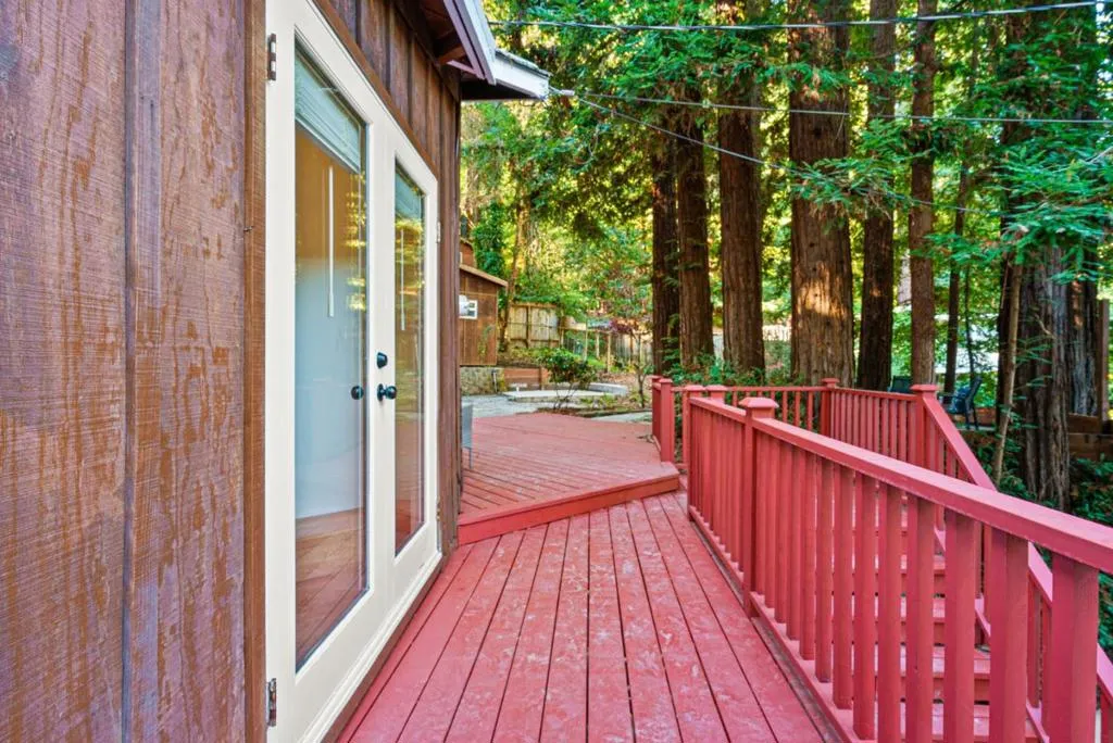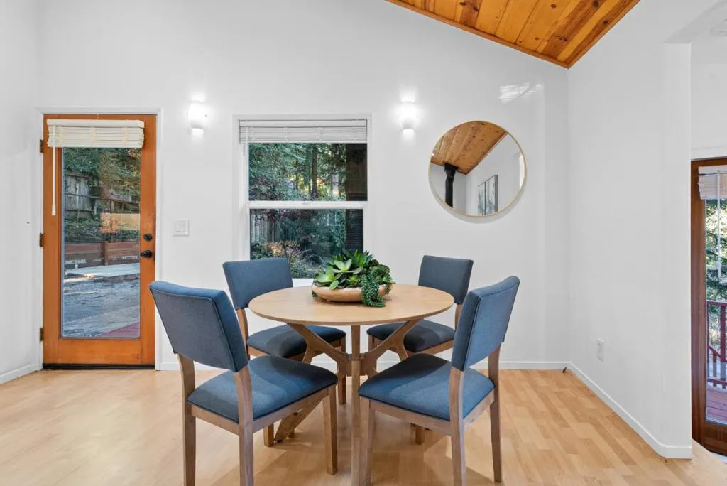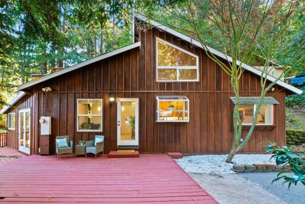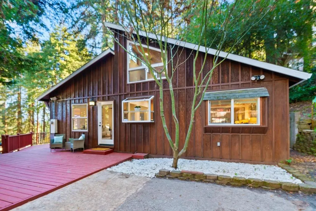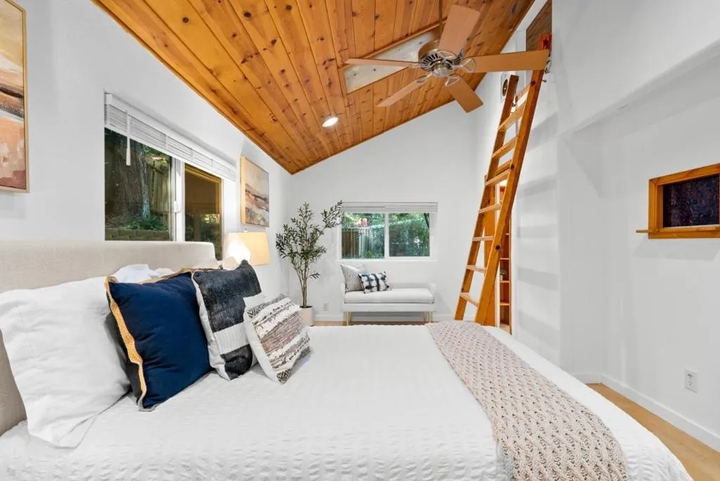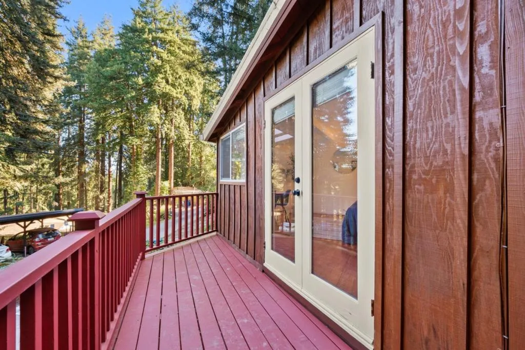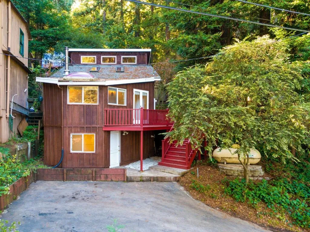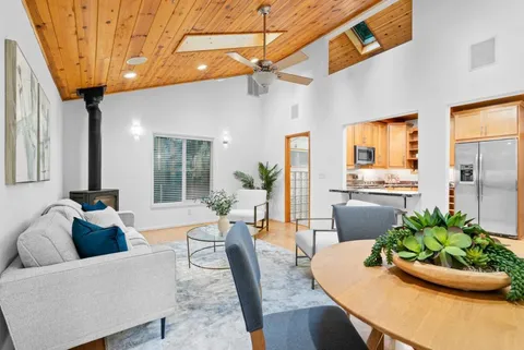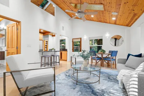 Discover the charm of this 2-bedroom, 1-bathroom home nestled in the heart of Ben Lomond. Step into the inviting living and dining areas, featuring vaulted wood ceilings, recessed lighting, and a warm, open ambiance. The kitchen boasts stainless steel appliances, stone countertops, and a picturesque garden window overlooking the majestic redwoods. Thoughtfully designed for privacy, the two spacious bedrooms are positioned on opposite sides of the home. The elegant bathroom is complete with tile floors, a stall shower, and a luxurious soaking tub. Adding to the homes versatility, a loft area - accessible from the primary bedroom - offers the perfect space for storage or a peaceful retreat. Dual-pane windows and skylights create a bright and airy feel throughout the home. Outside, relax on the stone patio with a cozy fire pit, encircled by towering redwoods - an idyllic spot to unwind after a day exploring the outdoors. Additional features include a washer/dryer and tankless water heater, both located in a storage room beneath the large deck. Situated in a serene neighborhood with access to miles of hiking trails, this home is a short drive to the charming shops, restaurants, and parks of Ben Lomond. Don't miss this opportunity to own a slice of paradise!