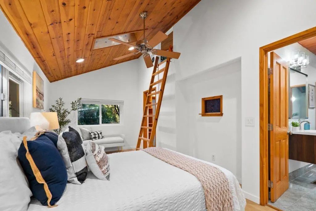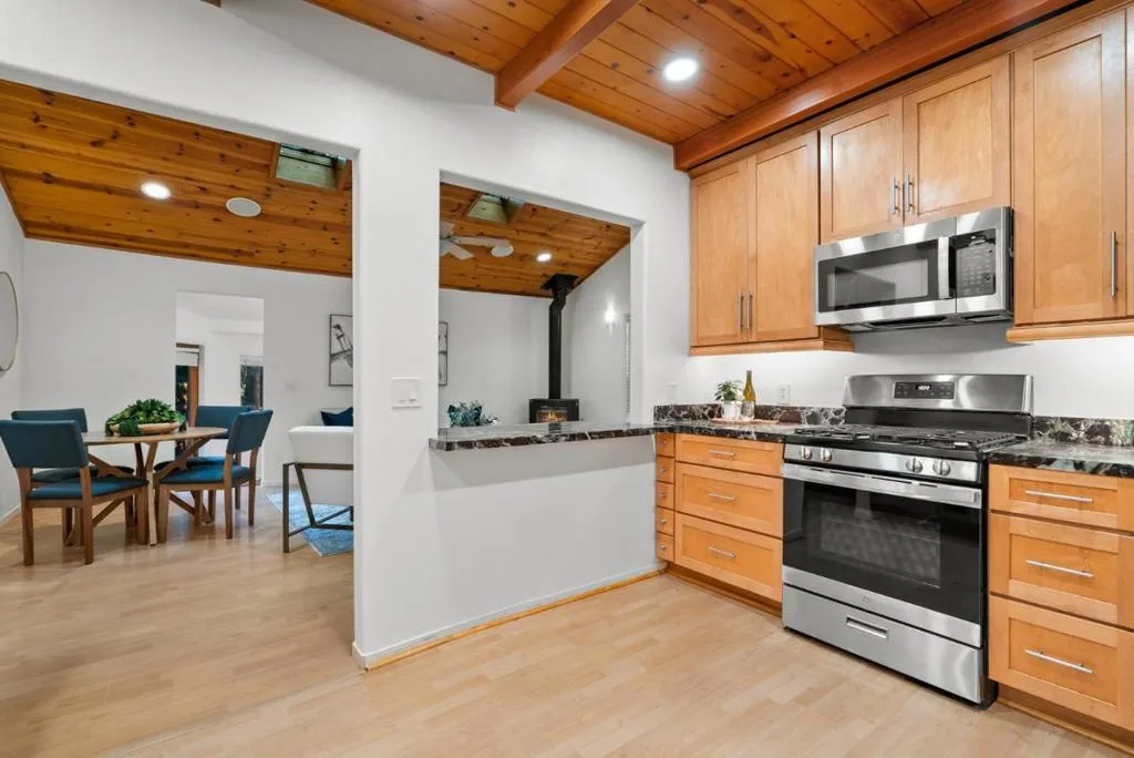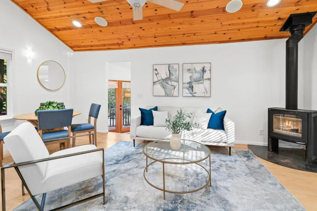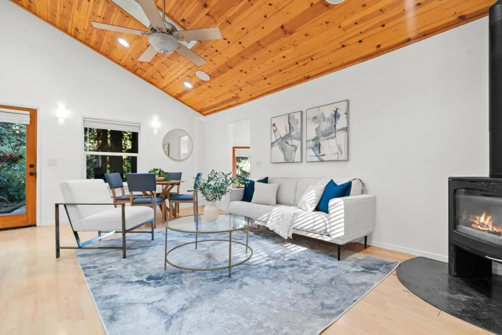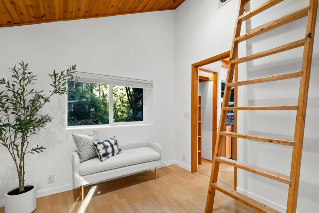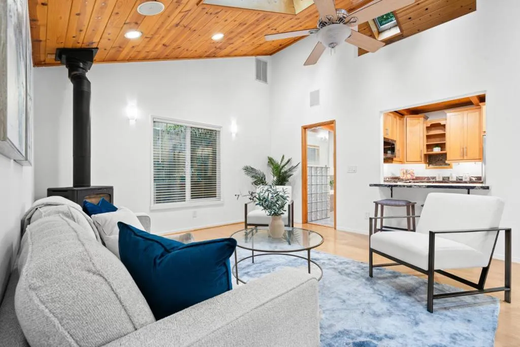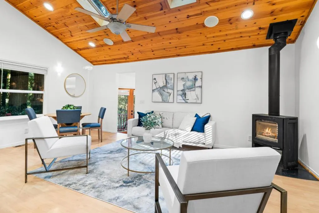 Discover the charm of this 2-bedroom, 1-bathroom home nestled in the heart of Ben Lomond. Step into the inviting living and dining areas, featuring vaulted wood ceilings, recessed lighting, and a warm, open ambiance. The kitchen boasts stainless steel appliances, stone countertops, and a picturesque garden window overlooking the majestic redwoods. Thoughtfully designed for privacy, the two spacious bedrooms are positioned on opposite sides of the home. The elegant bathroom is complete with tile floors, a stall shower, and a luxurious soaking tub. Adding to the homes versatility, a loft area - accessible from the primary bedroom - offers the perfect space for storage or a peaceful retreat. Dual-pane windows and skylights create a bright and airy feel throughout the home. Outside, relax on the stone patio with a cozy fire pit, encircled by towering redwoods - an idyllic spot to unwind after a day exploring the outdoors. Additional features include a washer/dryer and tankless water heater, both located in a storage room beneath the large deck. Situated in a serene neighborhood with access to miles of hiking trails, this home is a short drive to the charming shops, restaurants, and parks of Ben Lomond. Don't miss this opportunity to own a slice of paradise!