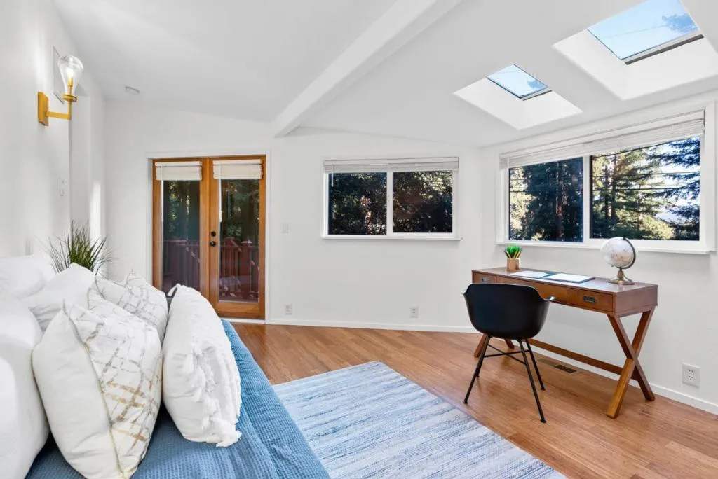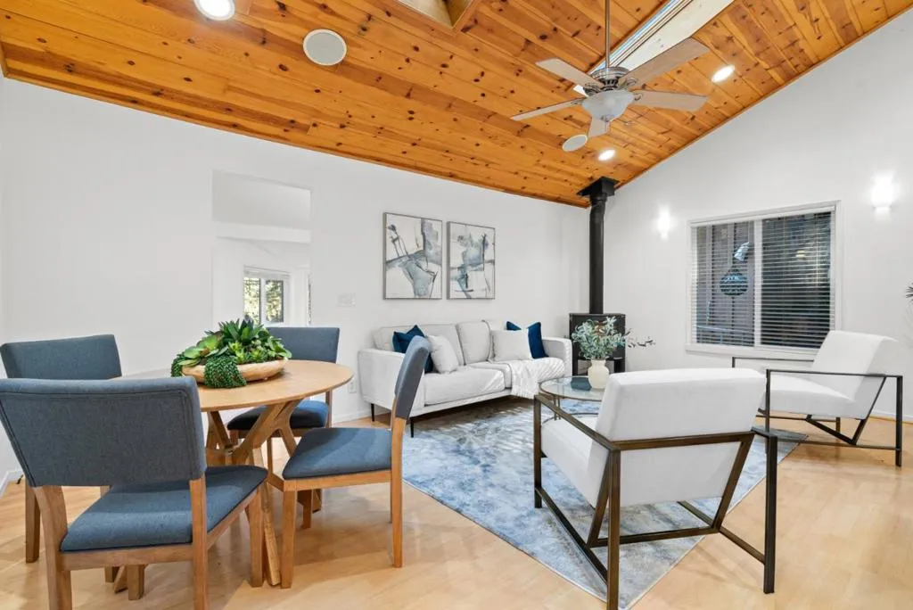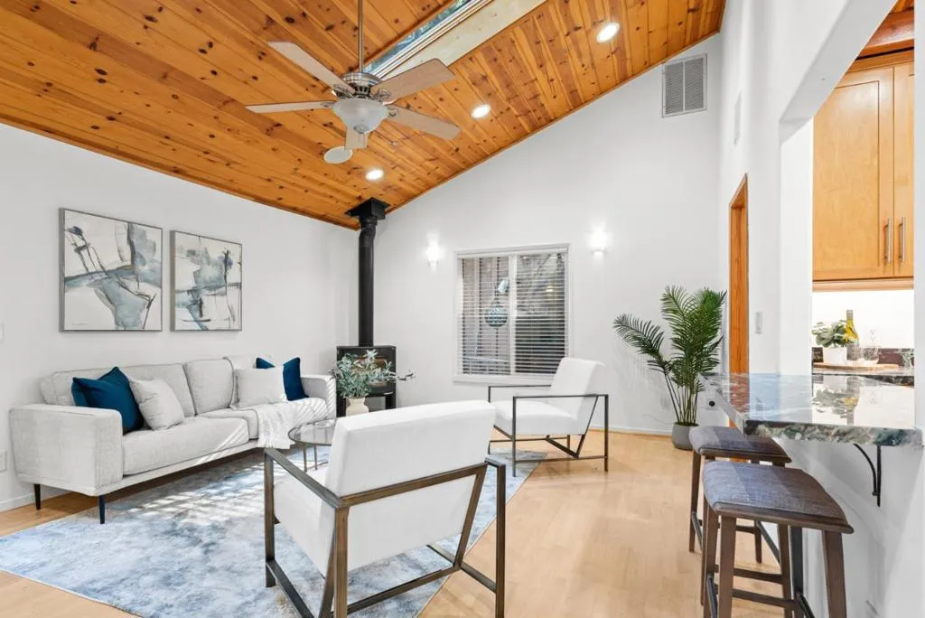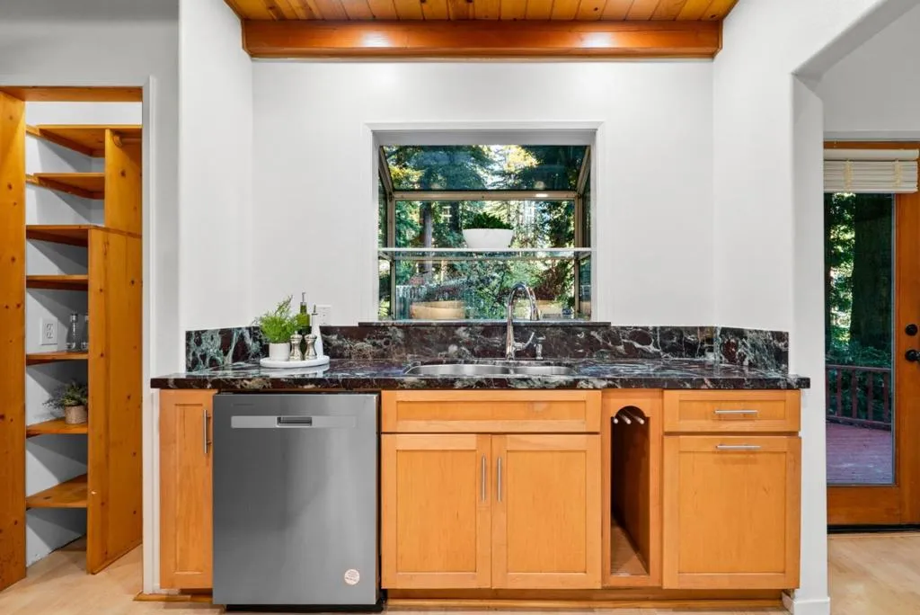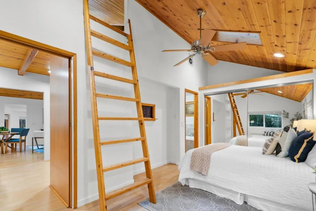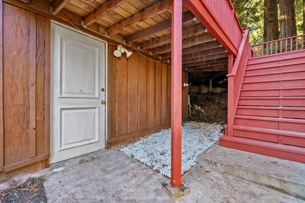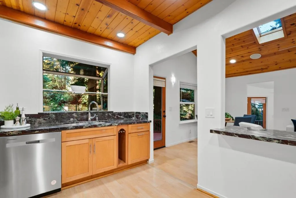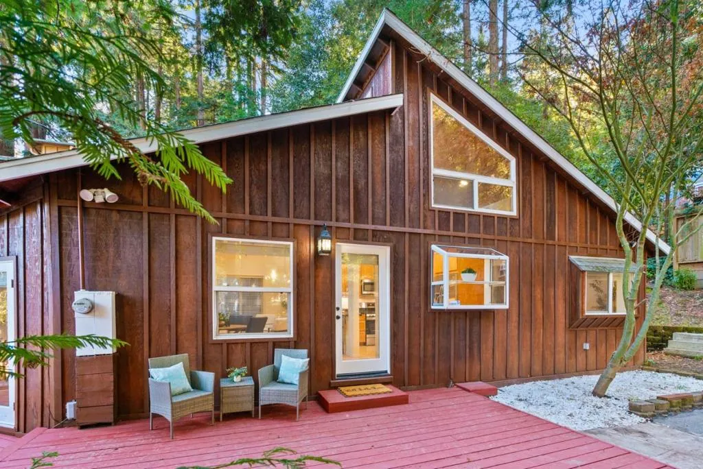 Discover the charm of this 2-bedroom, 1-bathroom home nestled in the heart of Ben Lomond. Step into the inviting living and dining areas, featuring vaulted wood ceilings, recessed lighting, and a warm, open ambiance. The kitchen boasts stainless steel appliances, stone countertops, and a picturesque garden window overlooking the majestic redwoods. Thoughtfully designed for privacy, the two spacious bedrooms are positioned on opposite sides of the home. The elegant bathroom is complete with tile floors, a stall shower, and a luxurious soaking tub. Adding to the homes versatility, a loft area - accessible from the primary bedroom - offers the perfect space for storage or a peaceful retreat. Dual-pane windows and skylights create a bright and airy feel throughout the home. Outside, relax on the stone patio with a cozy fire pit, encircled by towering redwoods - an idyllic spot to unwind after a day exploring the outdoors. Additional features include a washer/dryer and tankless water heater, both located in a storage room beneath the large deck. Situated in a serene neighborhood with access to miles of hiking trails, this home is a short drive to the charming shops, restaurants, and parks of Ben Lomond. Don't miss this opportunity to own a slice of paradise!