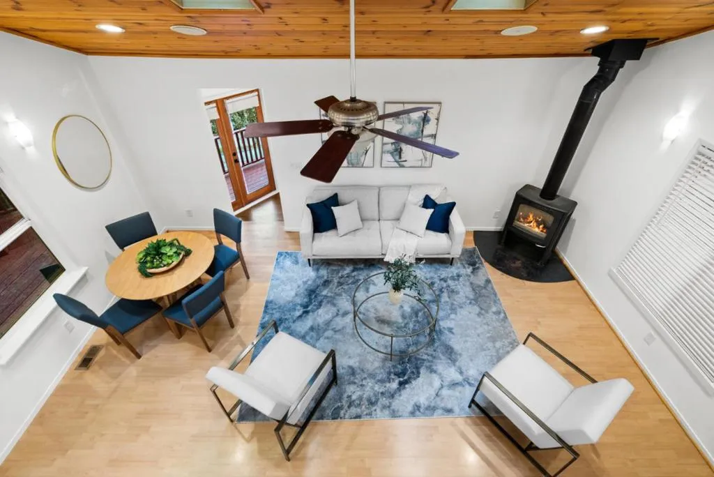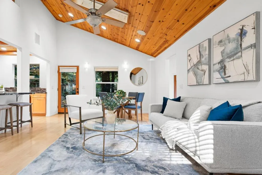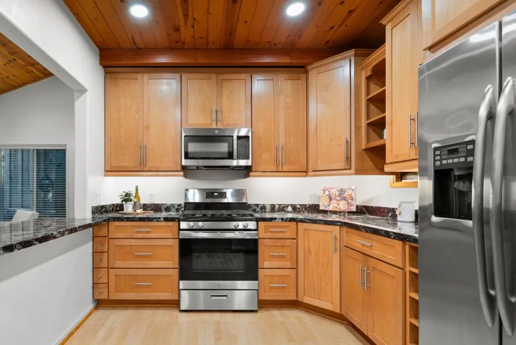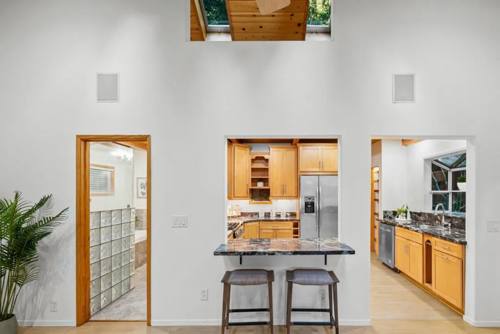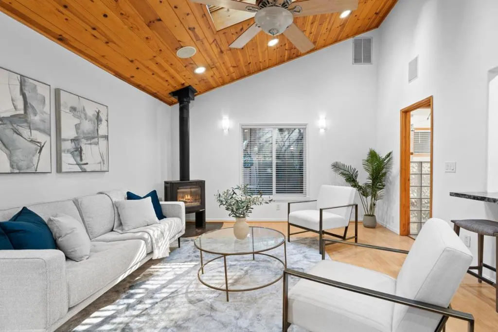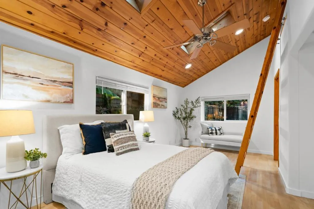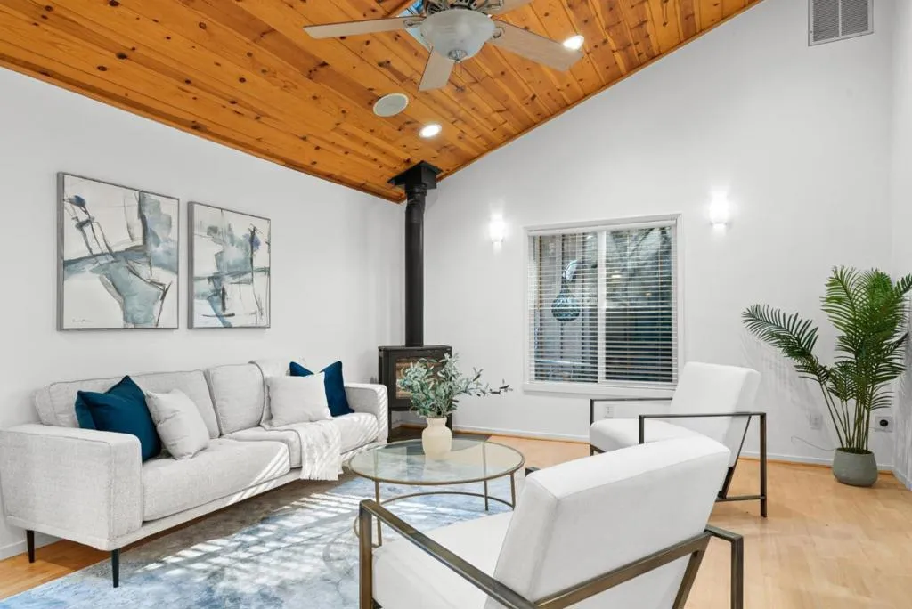 Discover the charm of this 2-bedroom, 1-bathroom home nestled in the heart of Ben Lomond. Step into the inviting living and dining areas, featuring vaulted wood ceilings, recessed lighting, and a warm, open ambiance. The kitchen boasts stainless steel appliances, stone countertops, and a picturesque garden window overlooking the majestic redwoods. Thoughtfully designed for privacy, the two spacious bedrooms are positioned on opposite sides of the home. The elegant bathroom is complete with tile floors, a stall shower, and a luxurious soaking tub. Adding to the homes versatility, a loft area - accessible from the primary bedroom - offers the perfect space for storage or a peaceful retreat. Dual-pane windows and skylights create a bright and airy feel throughout the home. Outside, relax on the stone patio with a cozy fire pit, encircled by towering redwoods - an idyllic spot to unwind after a day exploring the outdoors. Additional features include a washer/dryer and tankless water heater, both located in a storage room beneath the large deck. Situated in a serene neighborhood with access to miles of hiking trails, this home is a short drive to the charming shops, restaurants, and parks of Ben Lomond. Don't miss this opportunity to own a slice of paradise!