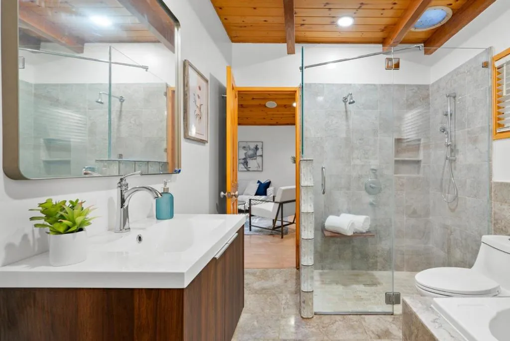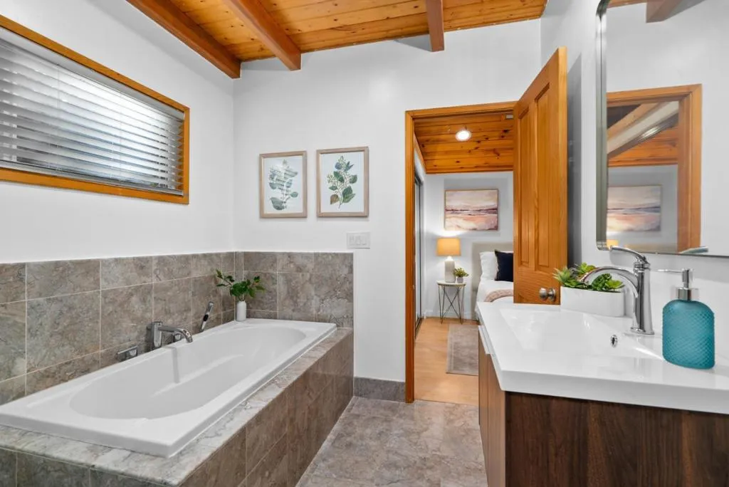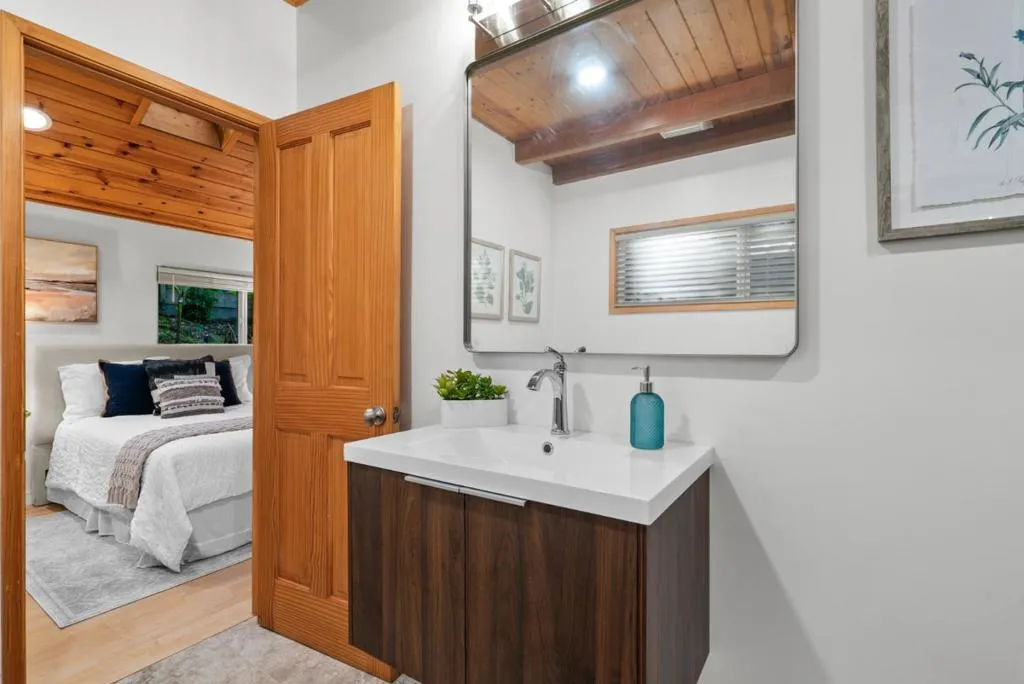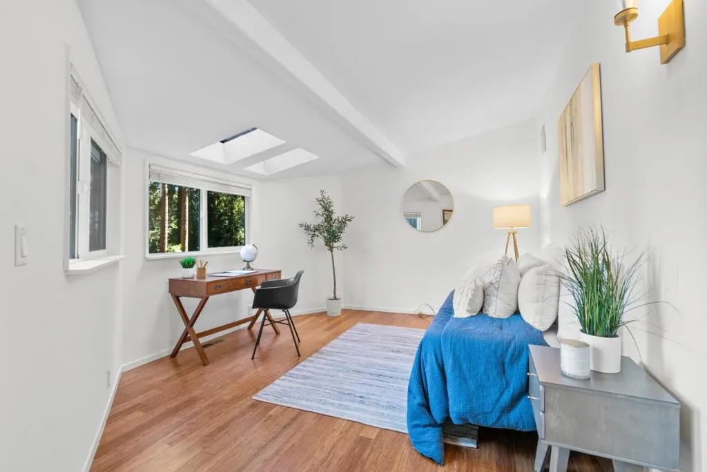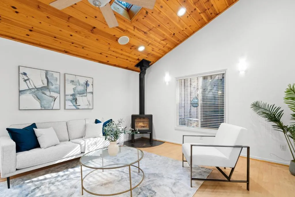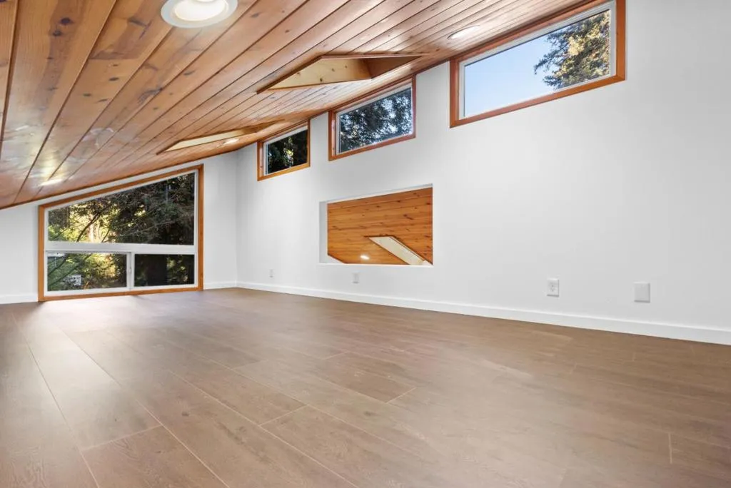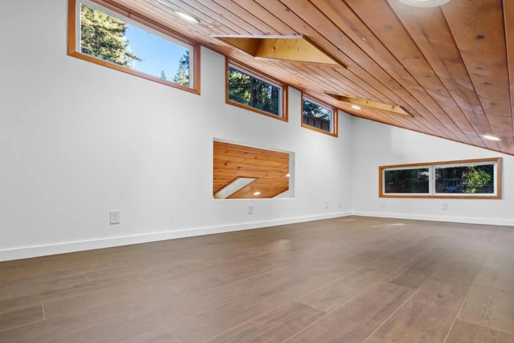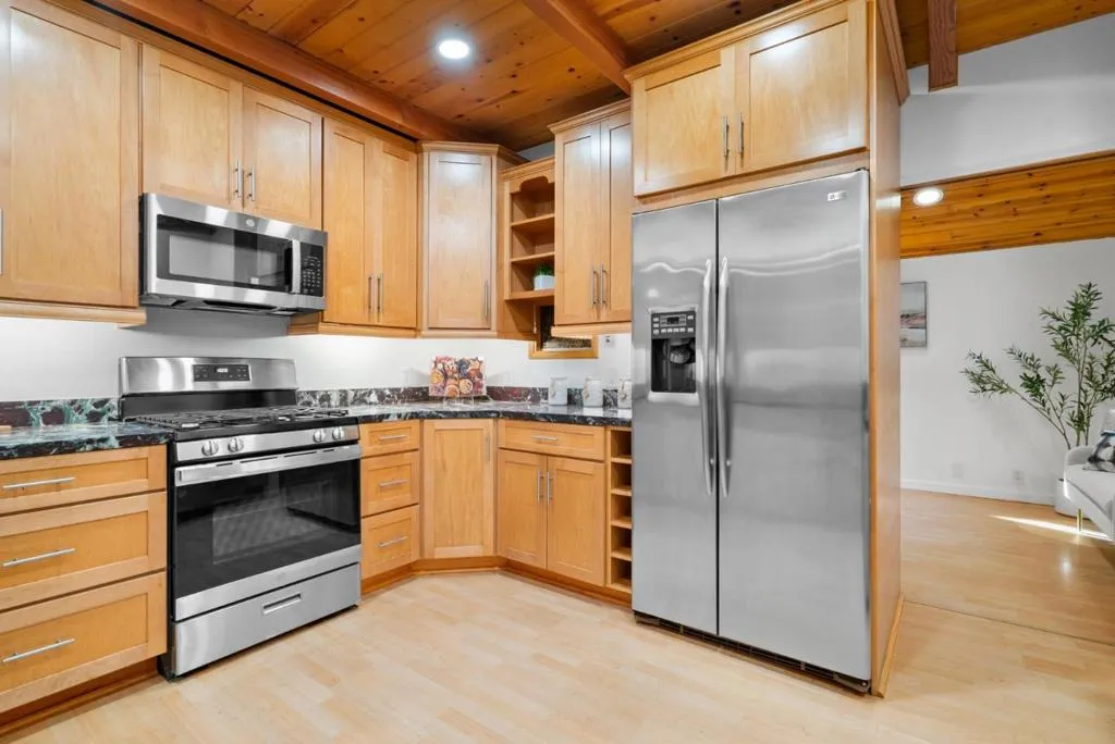 Discover the charm of this 2-bedroom, 1-bathroom home nestled in the heart of Ben Lomond. Step into the inviting living and dining areas, featuring vaulted wood ceilings, recessed lighting, and a warm, open ambiance. The kitchen boasts stainless steel appliances, stone countertops, and a picturesque garden window overlooking the majestic redwoods. Thoughtfully designed for privacy, the two spacious bedrooms are positioned on opposite sides of the home. The elegant bathroom is complete with tile floors, a stall shower, and a luxurious soaking tub. Adding to the homes versatility, a loft area - accessible from the primary bedroom - offers the perfect space for storage or a peaceful retreat. Dual-pane windows and skylights create a bright and airy feel throughout the home. Outside, relax on the stone patio with a cozy fire pit, encircled by towering redwoods - an idyllic spot to unwind after a day exploring the outdoors. Additional features include a washer/dryer and tankless water heater, both located in a storage room beneath the large deck. Situated in a serene neighborhood with access to miles of hiking trails, this home is a short drive to the charming shops, restaurants, and parks of Ben Lomond. Don't miss this opportunity to own a slice of paradise!