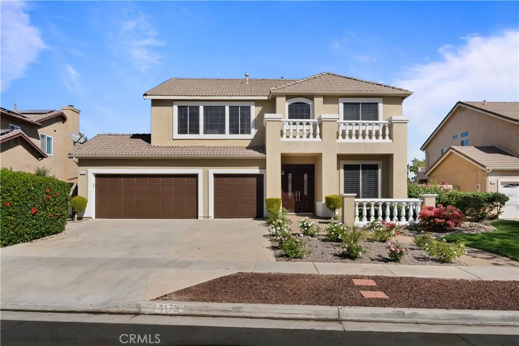 Situated on a serene cul-de-sac in one of South Corona s most desirable neighborhoods, 1173 Kestrel Circle exudes luxury, comfort, and timeless elegance. This stunning 4-bedroom, 3-bathroom home offers over 3,000 square feet of living space, perfectly crafted to elevate your lifestyle and meet your every need. As you arrive, the manicured landscaping and double door entry create a grand first impression. Step inside to discover a welcoming formal living and dining area, where porcelain tile and luxury vinyl flooring harmonize with plantation shutters and recessed lighting. Every space is thoughtfully designed to capture the essence of refined living, making it the perfect backdrop for cherished gatherings and quiet moments alike. The heart of the home is the beautiful kitchen featuring crisp white cabinetry, granite countertops, and a large kitchen island seamlessly open to the family room for a fluid, open concept feel. The inviting family features a cozy fireplace, creating a warm and relaxed environment for unwinding or entertaining guests. For added convenience, the main level includes a generously sized bedroom with an adjacent full bathroom featuring a walk-in shower, ideal for guests or multi-generational living. The laundry room completes the main level, equipped with ample storage and direct access to the 3-car garage. Make your way upstairs to the remaining 3 bedrooms, including the expansive primary suite, featuring a private balcony that overlooks the lush backyard and offers sweeping mountain views. His-and-her closets with built-ins provide ample storage, while the spa-like ensuite bathroom offers dual sinks, a separate soaking tub, and a walk-in shower. The secondary bedrooms are spacious, with the bedroom right off the stairs boasting an impressive walk-in closet. The hallway bathroom, with a dual sink vanity and a shower-in-tub combination, is beautifully appointed and easily accessible. At the end of the hallway, a versatile loft/bonus room offers endless possibilities, whether as an entertainment room, playroom, home gym, or office space tailored to your lifestyle needs. Step out to the peaceful backyard surrounded by lush green grass, mature landscaping, and the sparkling pool and spa, ideal for soaking up the California sun. Close proximity to parks, great schools, shopping, and dining with easy access to the 15/91 fwys.