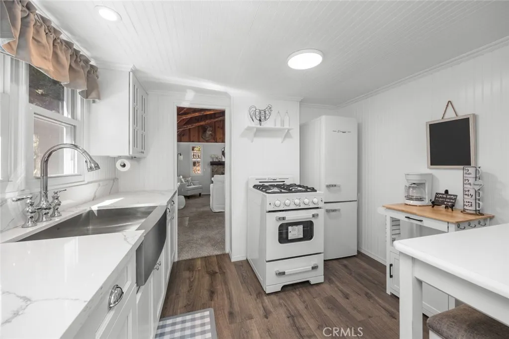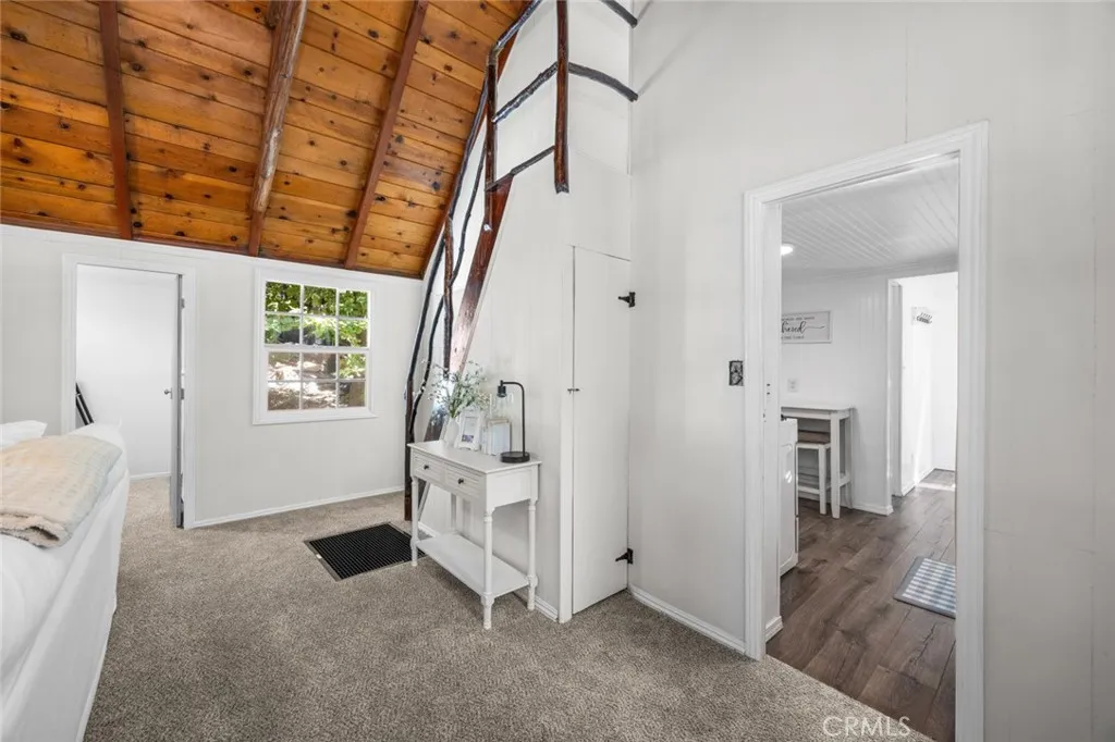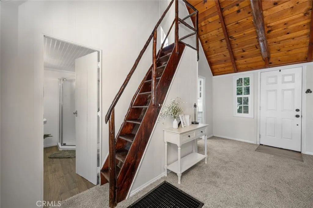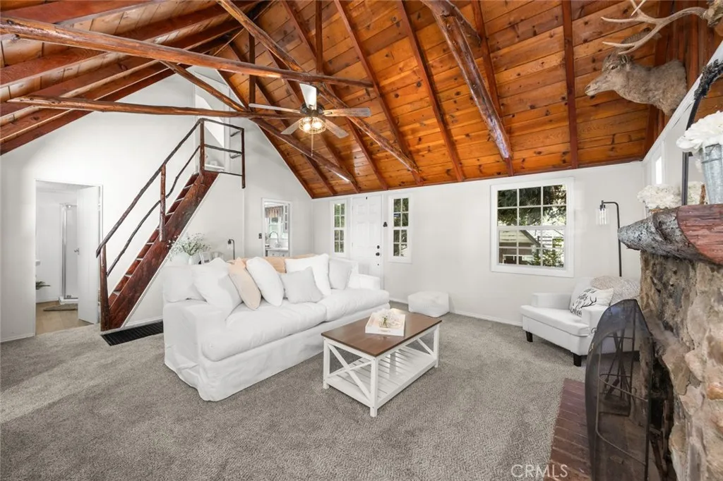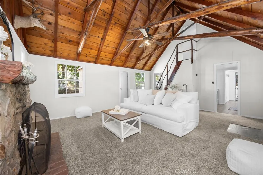 Step inside the high and exposed beamed living room and instantly feel at home. The love and detail poured into this cozy cabin will not go unnoticed. Nestled in the heart of Rimforest, this property offers the best of mountain living, quiet surroundings, nature and close to conveniences. Two bedrooms are located on the main floor and then two additional bedroom spaces are accessible through a small staircase. Below the cabin, there is a barn door to access much storage space. Plenty of yard in front and back for gatherings. All furnishings are brand new and staged to remain in the property and convey with the sale. Do not miss out!