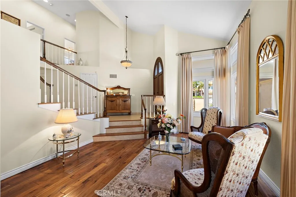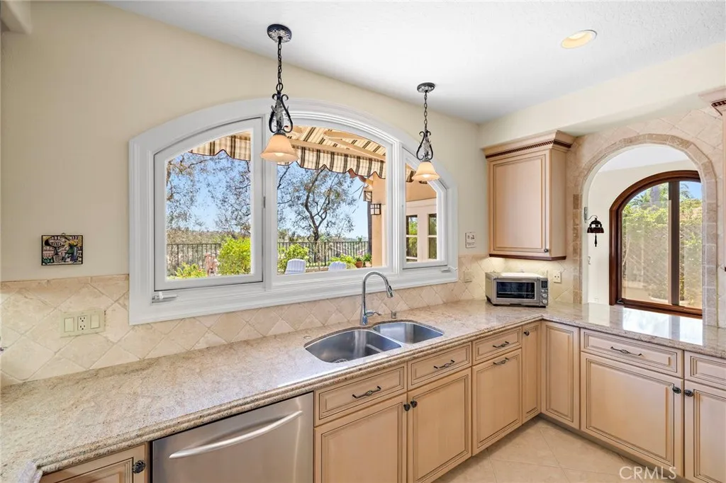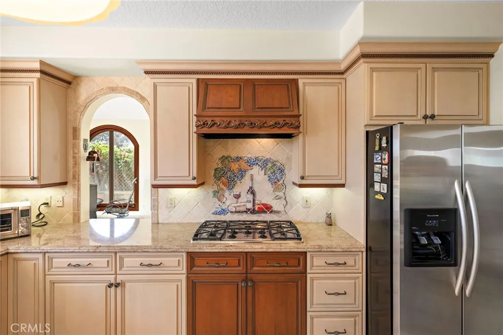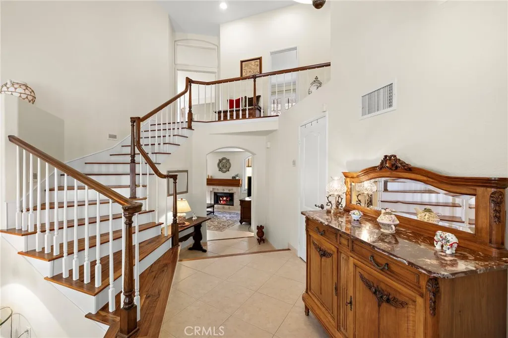 Welcome to this exquisitely upgraded 5-bedroom, 3.5-bathroom home offering 3,018 sq. ft. of luxurious living space, perfectly situated on an expansive lot with a partial scenic ocean view. From the moment you arrive, the Tuscan-inspired exterior makes a striking impression with custom-designed Renaissance windows and doors, professionally landscaped planter areas, high-end entry gates, and a sweeping decorative Olsen Pavers driveway leading to a spacious 3-car garage - delivering exceptional curb appeal. Step through the grand arched double doors and you'll immediately feel the pride of ownership in every detail. The entry opens into a warm and welcoming living and dining area with rich, handscraped Rustic Walnut wood flooring that flows seamlessly throughout much of the downstairs. Ideal for multigenerational living, a private, large downstairs bedroom with en-suite bath offers comfort and flexibility. The family room is an inviting retreat featuring a custom fireplace and opens into a bright and airy vaulted sunroom/office through elegant French doors. Bathed in natural light from expansive Renaissance arched windows, this versatile space is perfect for working, relaxing, or entertaining. The open-concept kitchen is a chef's dream - featuring a stunning arched picture window with backyard views, granite countertops, designer tile backsplash, top-of-the-line KitchenAid appliances, and a generously sized walk-in pantry with custom shelving. Upstairs, the expansive primary suite is a true sanctuary, complete with a spacious retreat area that can easily function as an additional bedroom or private lounge. The spa-inspired en-suite bath is beautifully appointed with marble floors and walls, an Aruba Gold travertine shower, and matching vanity countertops that add elegance and warmth. All bathrooms throughout the home have been equally upgraded with luxurious finishes. Step outside to a beautifully landscaped backyard oasis with lush greenery, an elaborate Olsen Pavers patio, and thoughtfully designed planter areas - perfect for entertaining or enjoying the peaceful coastal breeze. From here, take in the partial ocean view and serene atmosphere. This home is truly a rare find - thoughtfully upgraded, meticulously maintained, and move-in ready. Your buyers will be impressed by the exceptional quality, attention to detail, and timeless design throughout.