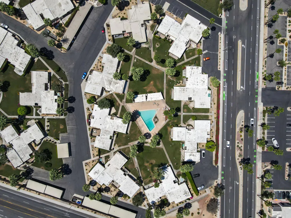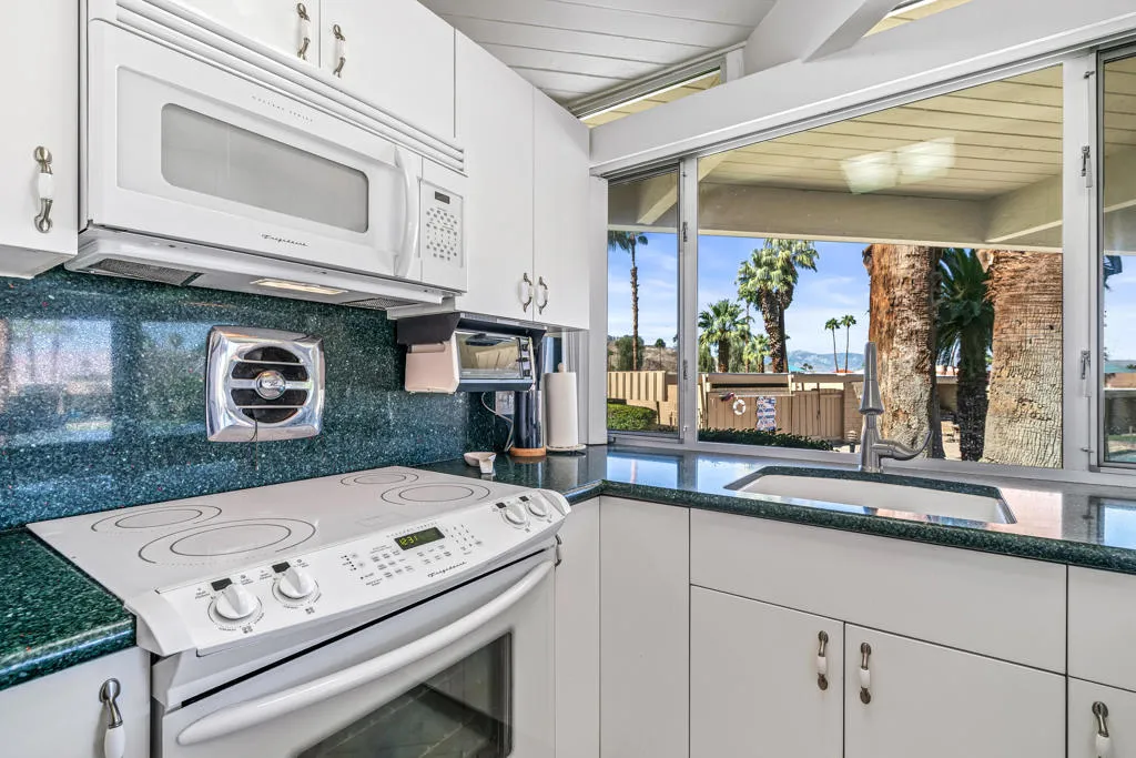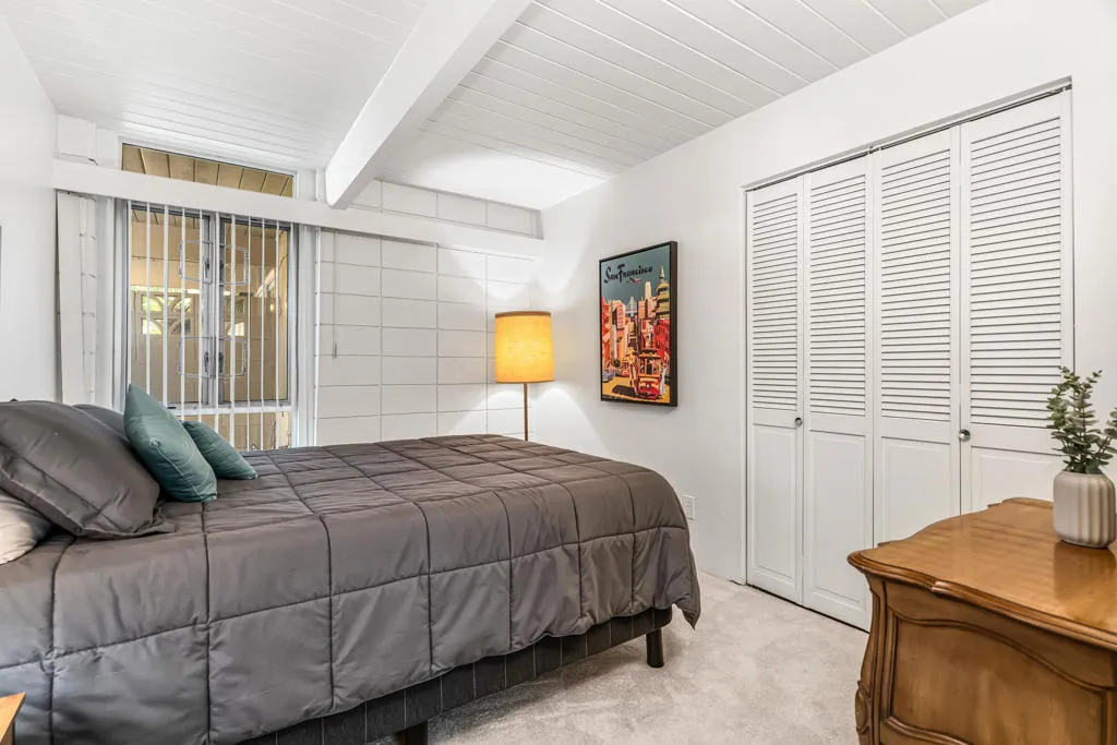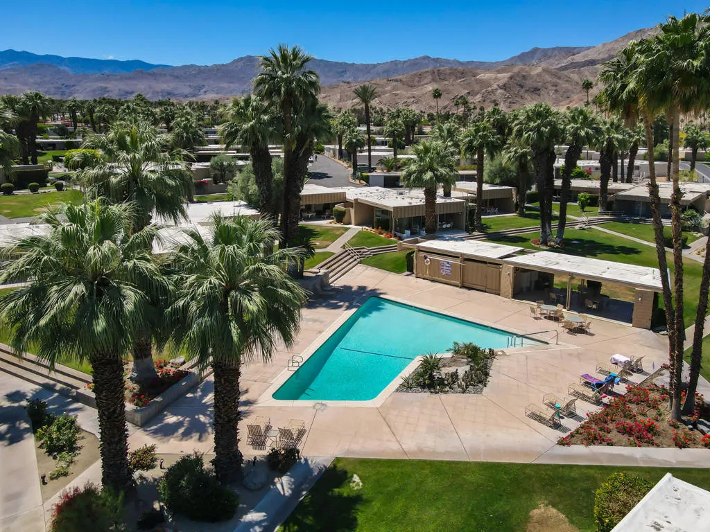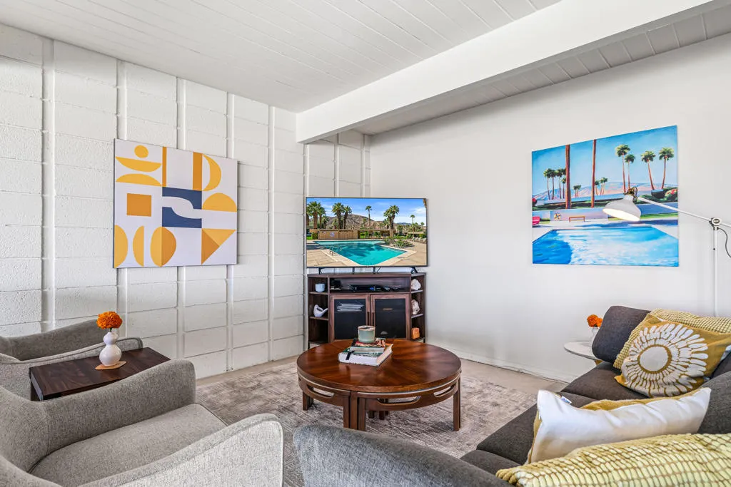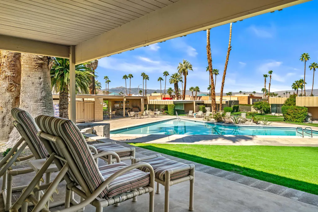 Mid-Century Sandpiper Gem! Step into the timeless allure of this classic Wm. Krisel-designed Sandpiper condo -- one of the original mid-century units that beautifully blends iconic architectural details with thoughtful updates. Signature exposed concrete block walls, tongue-and-groove ceilings, and walls of glass capture the essence of true desert modernism.This 2-bedroom, 2-bath home features tile flooring throughout the main living areas and carpeting in both bedrooms. The open-concept living and dining space is anchored by an updated kitchen with sleek cabinetry, laminate countertops, and modern appliances.Enjoy dual-paned poolside sliders that open to a spacious patio overlooking lush greenbelt views, the sparkling pool, and the northern mountain backdrop. The private patio off the primary suite offers a quiet retreat and includes convenient outdoor laundry.Both bathrooms maintain their mid-century character while incorporating updated vanities and fixtures.Located in one of Palm Desert's most desirable and historically designated sections of Sandpiper, this home is eligible for the Mills Act, offering potential property tax savings. Just minutes from the shops and restaurants of El Paseo, this mid-century treasure is ready to become your next desert retreat.