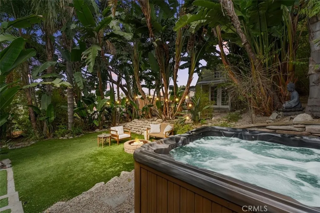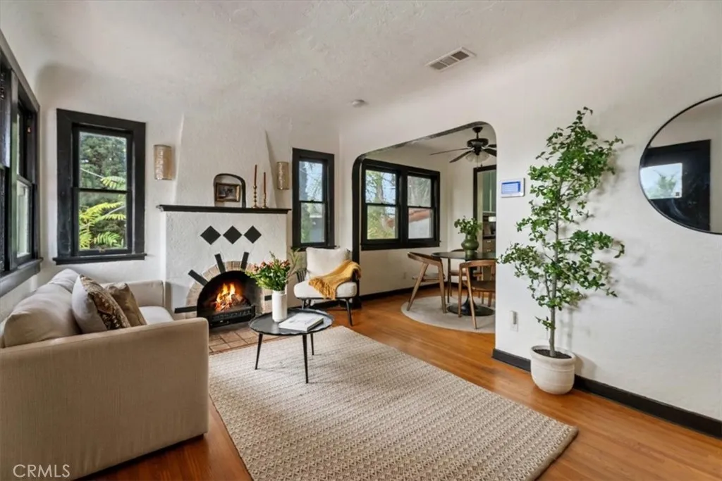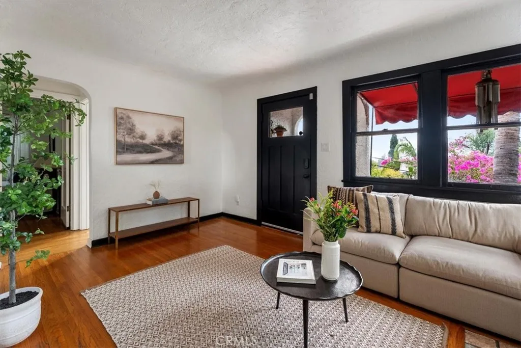 Set above the street behind lush landscaping, this 1929 Echo Park Spanish Revival is a true trophy property. Through the arched entry, you will find a patio with stunning views. The formal living room features hardwood floors, walls of windows, a stunning fireplace surround and arched doorways on both sides. Through the formal dining room, you will find an updated kitchen with raised ceilings, peaceful views of the yard, and a breakfast table. Beyond the kitchen is a family room with a private patio and media system that controls the zoned interior/exterior speaker system. The primary bedroom and en-suite bath are the newest addition to the home bringing the vibes of a luxury resort and spa featuring vaulted ceilings, built ins, designer finishes, and remarkable natural light shining through the large windows. The secondary bedrooms are well appointed with generous windows, closet space, and a remodeled bathroom. Step outside to a remodeled backyard oasis featuring a jacuzzi, fire-pit, outdoor kitchen, multiple dining and entertaining spaces and a detached two-level bonus studio. Facing the street there are 4 temperature controlled, generous sized, finished garage spaces. Enjoy the thoughtful upgrades like the central HVAC, laundry area, two tankless water heaters, and ADT. Do not miss this one of a kind him in one of the hottest neighborhoods in LA.