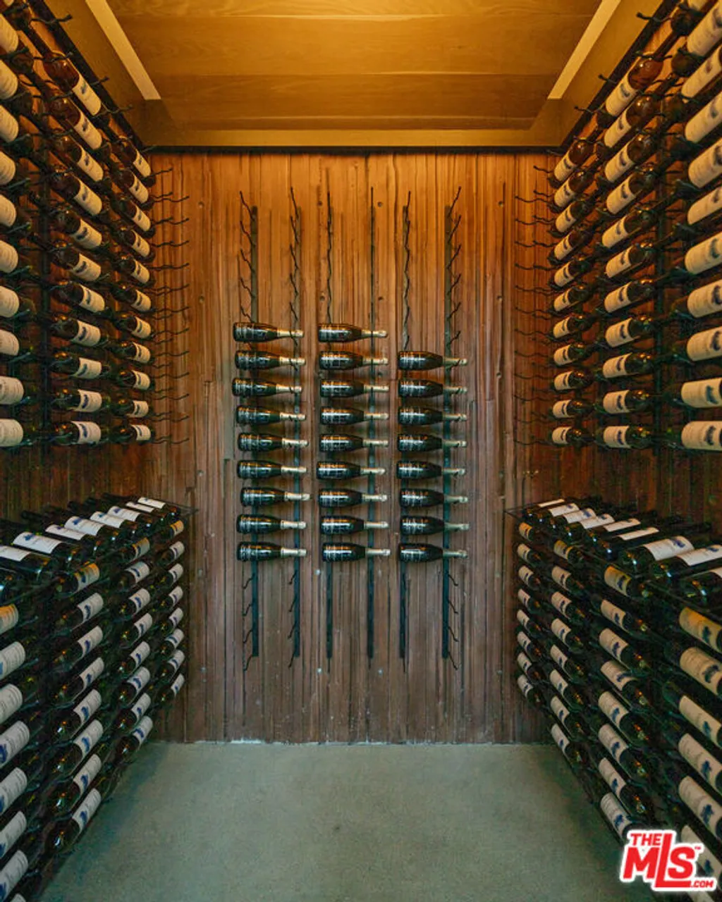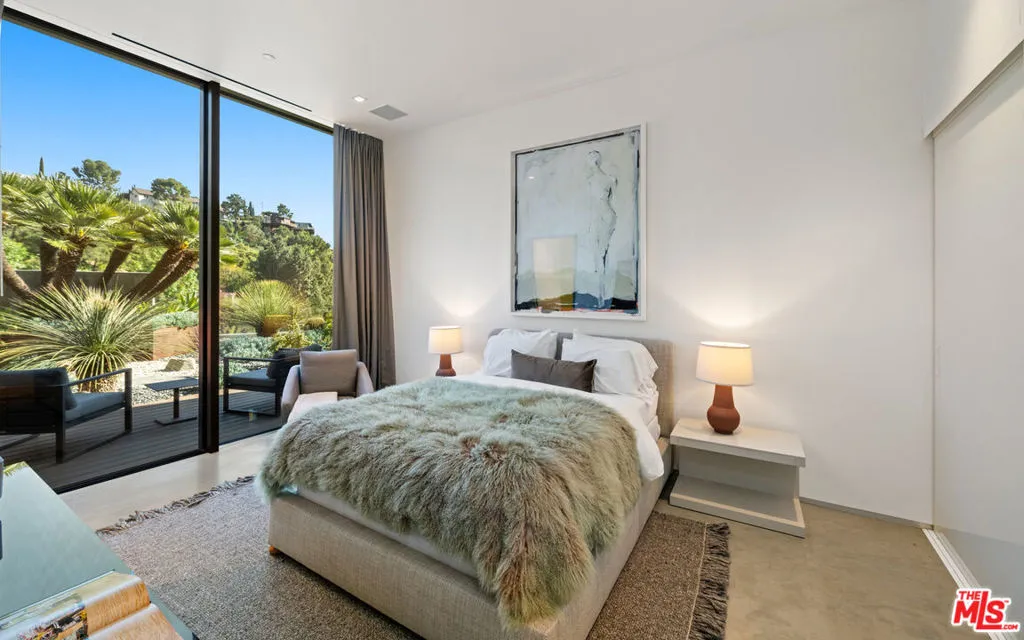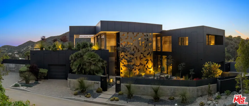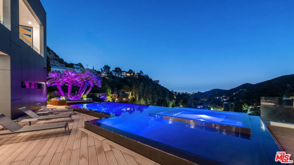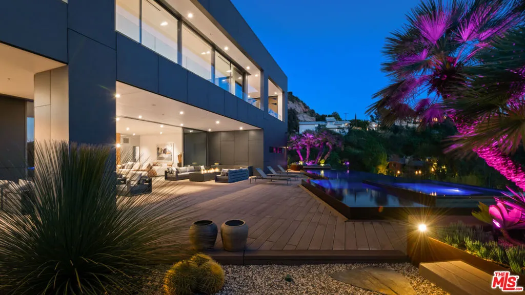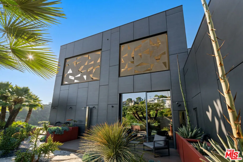 A symbol of design excellence, superior quality and exceptional structure. Crafted by Swiss architect Design21 as a haven of modern aesthetics embodying structural integrity, there is a seamless integration of glass, steel, oak wood and concrete elements providing breathtaking views of the mountains, valley and Pacific Ocean. Elevated above the hillside, this residence embraces nature as its living space opens to 1,800 SF of sleek deck space. The dark exterior and gold geometric sculptures captures sunlight, contrasting with meticulously landscaped succulents. Beyond the dramatic entryway discover the spacious 12-foot ceilings and open floor plan. Scenic views are seamlessly integrated into the design, spanning from the state of the art kitchen, dining and living areas to 4 bedrooms, 5 bathrooms, an upstairs gallery space, and a plush home theater. LEED inspired, this home utilizes solar-power for pool and radiant heated flooring, eco-materials and fire-resistant, waterproof triple-panel windows. Swiss technology and steel fixtures enhance the security of this home. Surrounded by an outdoor veranda, beautifully landscaped exterior spaces, and a 40-foot black-lined infinity pool/spa that reflects the refined Swiss-standard aesthetics, this exquisite art piece in the Beverly Hills Canyon epitomizes exclusive elegance and tranquility.