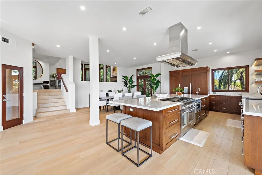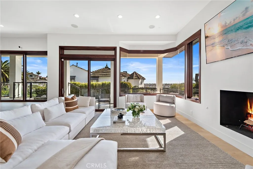 Nestled on a coveted corner lot, this exceptional estate sits beside Cliff Drive Park on one side and just steps away from a lush greenbelt on the other, creating a unique blend of privacy, beauty, and convenience. With sweeping views of the ocean, harbor, and Catalina Island, this property is a true masterpiece of coastal living. Spanning over 5,000 square feet, this five-bedroom (optional sixth) home, with five-and-a-half baths, offers a seamless fusion of luxury, design, and natural surroundings. The entry is framed by a serene walkway with water features leading to double doors. Inside, the open foyer with soaring ceilings, a central fireplace, and expansive Marvin windows create a bright, welcoming atmosphere. Wood and stone flooring and custom millwork add a refined touch, while sunken common areas enhance the sense of space. On the main level, you'll find two spacious en suite bedrooms, a formal living room, a wine room, and an open-concept dining area that flows into a gourmet kitchen and family room. The kitchen features Thermador appliances, a 13-foot "Bistro"-style island, quartz countertops, and custom cabinetry. Glass doors open to a covered terrace, offering sweeping harbor views. The private wing is home to the primary suite, which includes a fireplace, private balcony, a large walk-in closet, and a spa-like bath. On the same level, a media room, library, office, two additional en suite bedrooms with built-in study areas, and an upstairs family room complete the living spaces. Outside, the backyard is an entertainer's dream, featuring a saltwater pool, built-in BBQ, and plenty of space for al fresco dining, all framed by breathtaking coastal views. Other highlights include a Vantage lighting system, a laundry room, and a sweeping driveway leading to a three-car garage, all set amidst beautifully manicured landscaping. Located just minutes from shopping, dining, and the Balboa Peninsula, this home offers the perfect combination of privacy, luxury, and convenience.