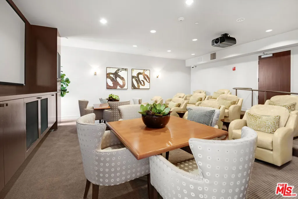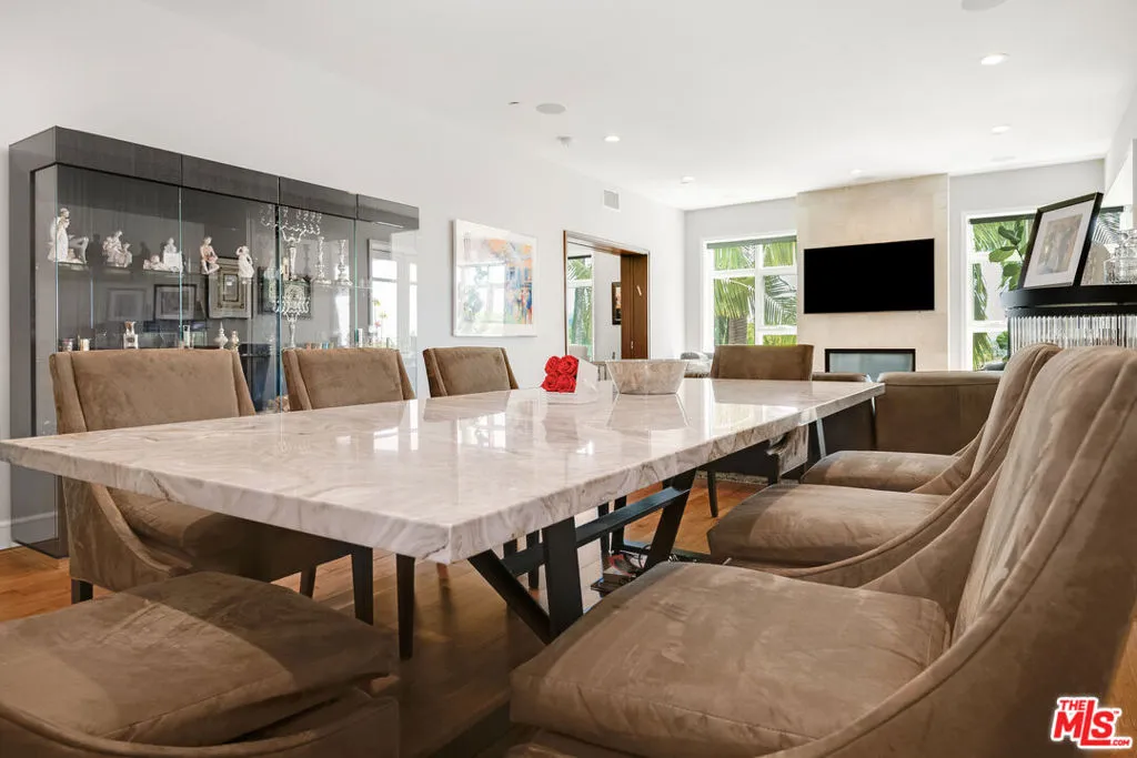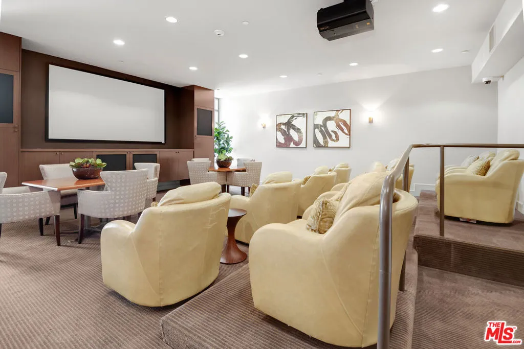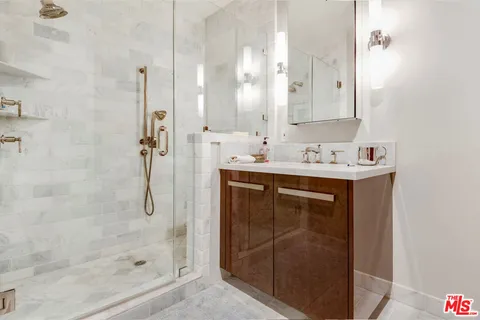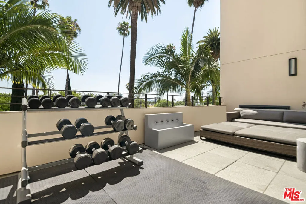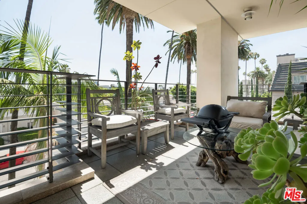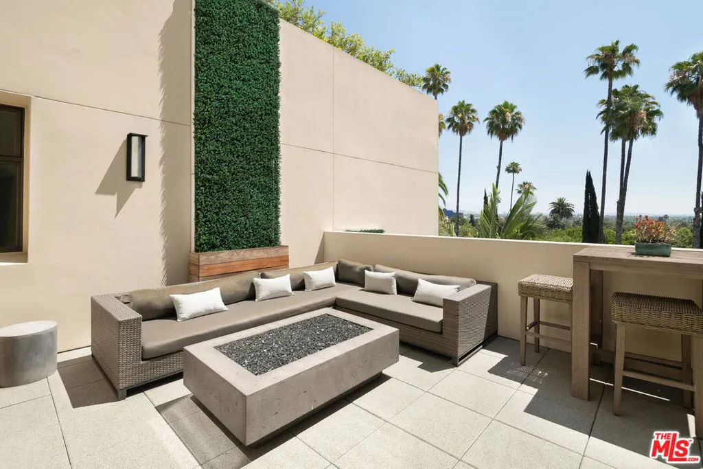 Front-facing 2-bedroom, 2.5-bath residence in the full-service La Terrasse condominium building in Beverly Hills. This luxury condo features brushed walnut and limestone flooring, a floor-to-ceiling limestone fireplace, solid-core mahogany doors, and high-gloss Italian burled walnut and sycamore cabinetry. The kitchen offers polished marble and granite countertops along with top-of-the-line appliances.The spacious primary suite includes a spa-style bathroom with separate soaking tub and shower. Multiple walk-in and built-in closets provide ample storage. In-unit washer and dryer included.Unit includes three side-by-side parking spaces and two large private storage units. La Terrasse amenities include concierge/guard service, secure gated parking, reception lobby, media room, fitness center, club terrace, and a fourth-floor sun terrace with city views. Conveniently located in Beverly Hills and near the Sunset Strip, the Golden Triangle, Bristol Farms, Melrose Place, and Robertson Boulevard shopping and dining.
