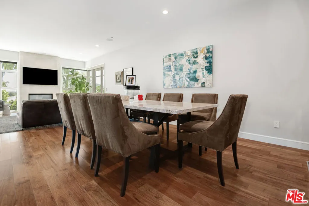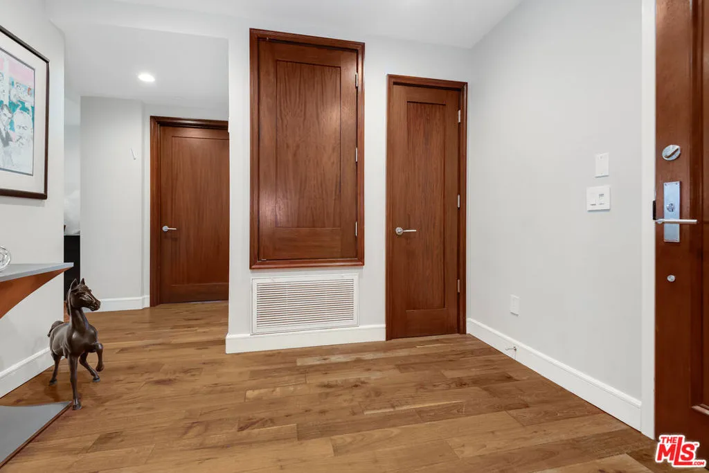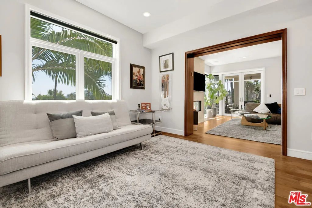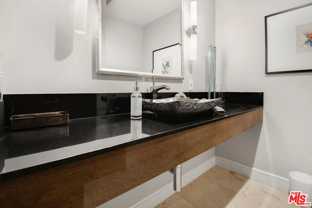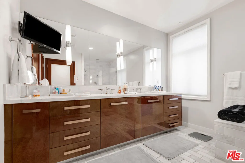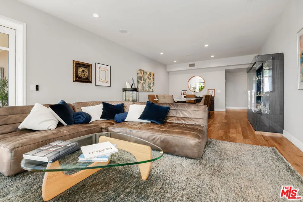 Front-facing 2-bedroom, 2.5-bath residence in the full-service La Terrasse condominium building in Beverly Hills. This luxury condo features brushed walnut and limestone flooring, a floor-to-ceiling limestone fireplace, solid-core mahogany doors, and high-gloss Italian burled walnut and sycamore cabinetry. The kitchen offers polished marble and granite countertops along with top-of-the-line appliances.The spacious primary suite includes a spa-style bathroom with separate soaking tub and shower. Multiple walk-in and built-in closets provide ample storage. In-unit washer and dryer included.Unit includes three side-by-side parking spaces and two large private storage units. La Terrasse amenities include concierge/guard service, secure gated parking, reception lobby, media room, fitness center, club terrace, and a fourth-floor sun terrace with city views. Conveniently located in Beverly Hills and near the Sunset Strip, the Golden Triangle, Bristol Farms, Melrose Place, and Robertson Boulevard shopping and dining.