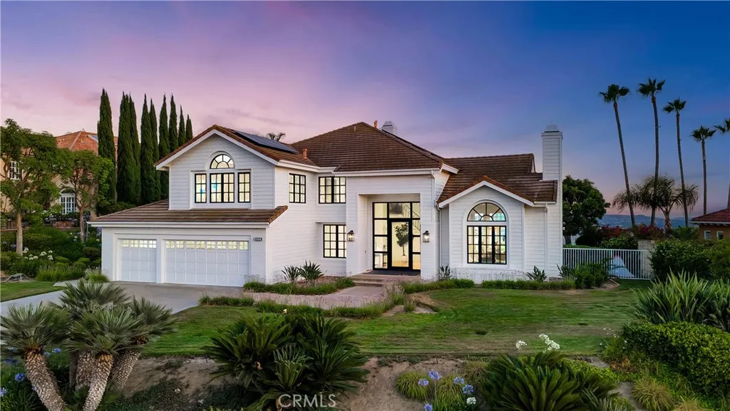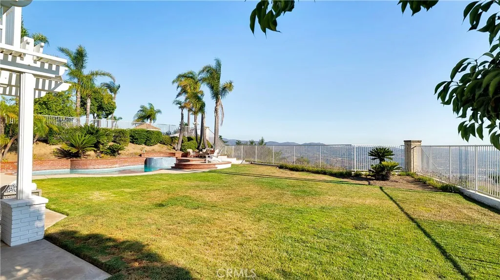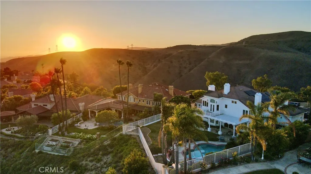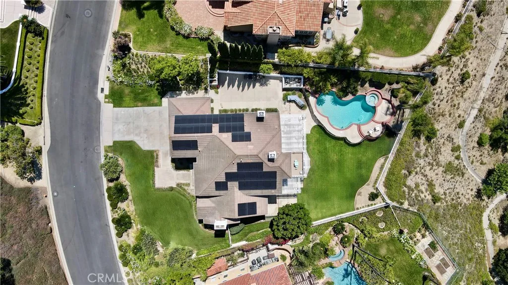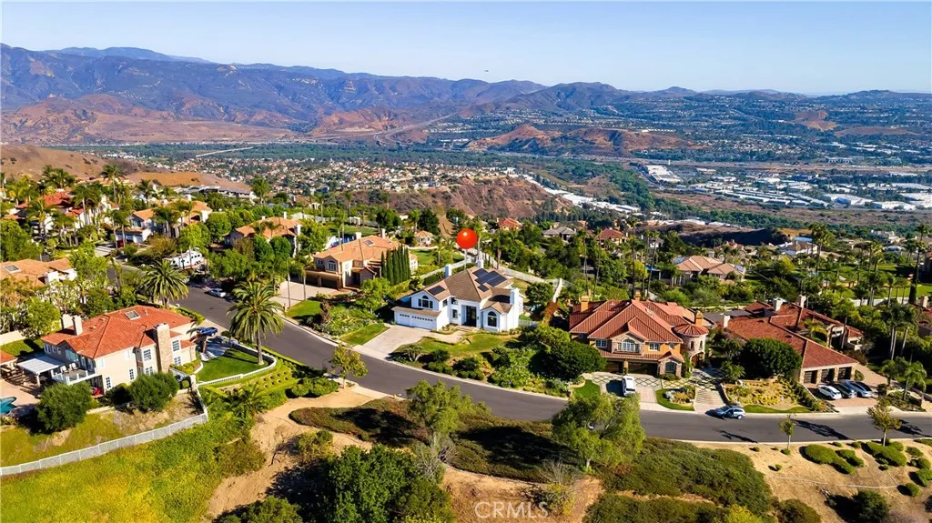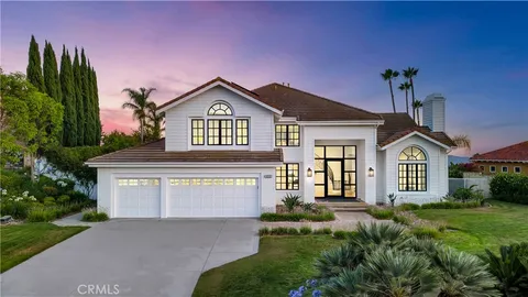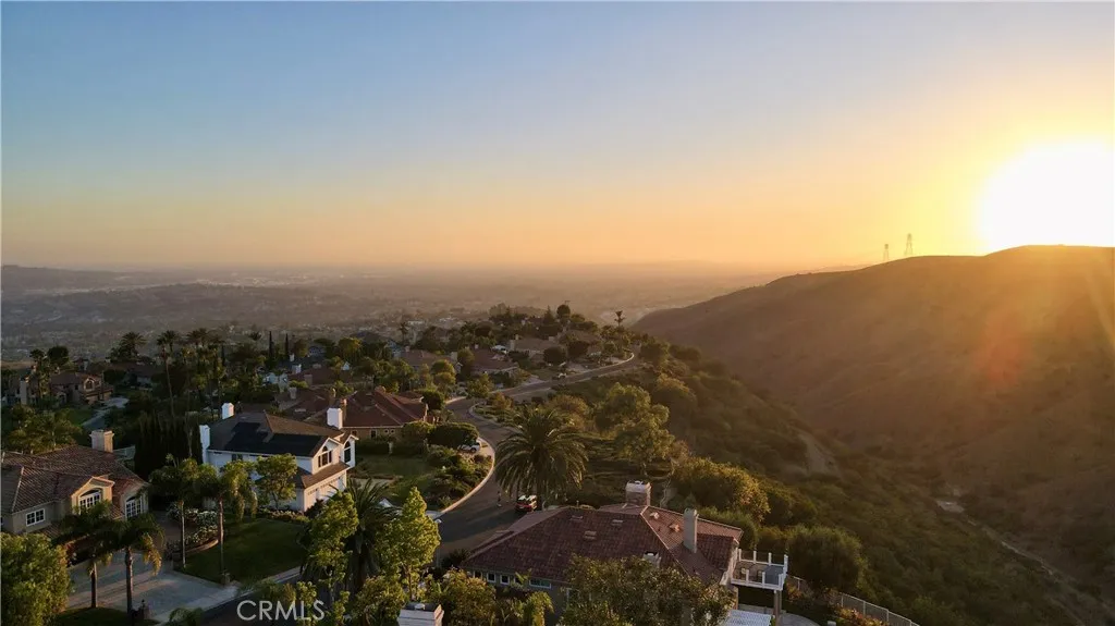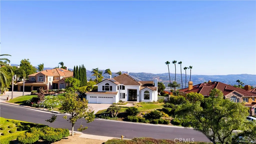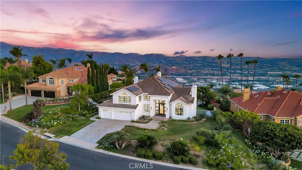 Perched at the top of the prestigious Hidden Hills neighborhood of Yorba Linda, 4855 Green Crest Drive is a ONE-OF-A-KIND ARCHITECTURAL GEM offering PRIVACY, PANORAMIC VIEWS, AND LUXURY AT EVERY TURN. With no neighbor in front, the home captures sweeping canyon and sunset views, while the backyard opens to unobstructed city lights, creating a serene setting to unwind after a long day. From the moment you step through the custom glass entryway, you're greeted by dramatic ceilings, a contemporary chandelier, and an opal white satin marble staircase that sets the tone for the rest of the home. Natural light floods the space, while French oak hardwood floors add warmth and sophistication highlighting the seamless flow and elegant finishes throughout. The formal living room centers around a striking floor-to-ceiling quartzite fireplace, while the adjacent dining room is surrounded by picture windows that frame peaceful garden views. The heart of the home is the chef's kitchen, featuring dual-tone European-style custom cabinetry, quartz counters, and a frameless bay window that invites the outdoors in. Outfitted with SubZero and Wolf appliances, and a generous center island with waterfall counters, this kitchen is as functional as it is beautiful. Just off the kitchen, a casual dining nook and spacious family room make everyday living feel elevated. The main level also offers an ensuite bedroom, ideal for guests or multigenerational living, along with a versatile flex space perfect for a home gym or office. Upstairs, the primary suite is a true retreat with its vaulted ceilings, cozy fireplace, spa-like bath with large marble shower, dual sink, freestanding bathtub, and two large custom walk-in closets. Step onto the private balcony to soak in the breathtaking views, day or night. A large upstairs bonus room with canyon views and full bath offer endless possibilities, whether as an additional bedroom, media room, or playroom. Each bathroom has been thoughtfully designed with iron and marble Hudson vanities with frameless glass tiled showers. The expansive backyard is designed for unforgettable gatherings, with multiple entertaining and dining areas, a large pool and spa, BBQ island, and postcard-worthy views in every direction. Additional features include a PAID 52-panel solar system, EV charging, motorized shades, designer lighting, modern HVAC vents, and 3-car garage. This is not just a home, it's a statement of timeless design, comfort, and California luxury.