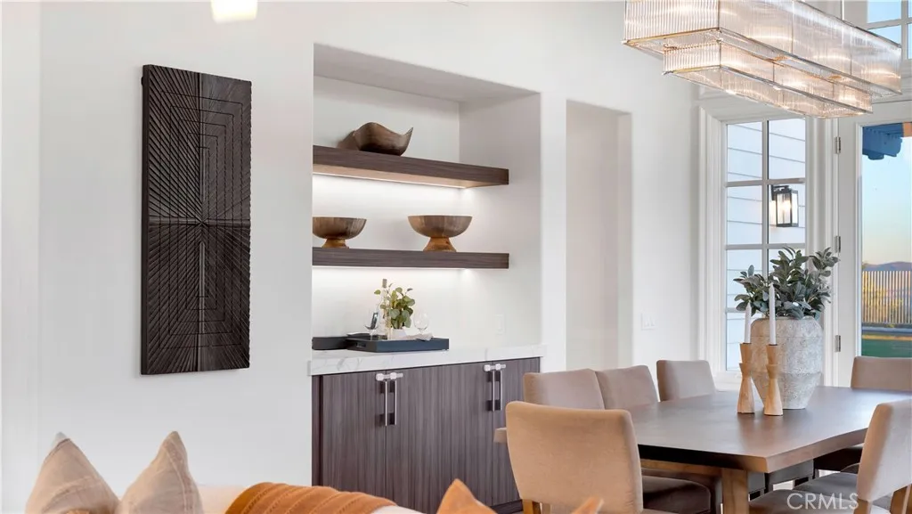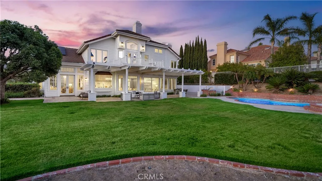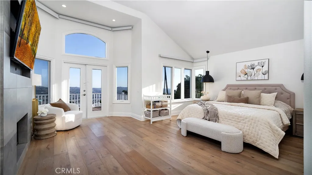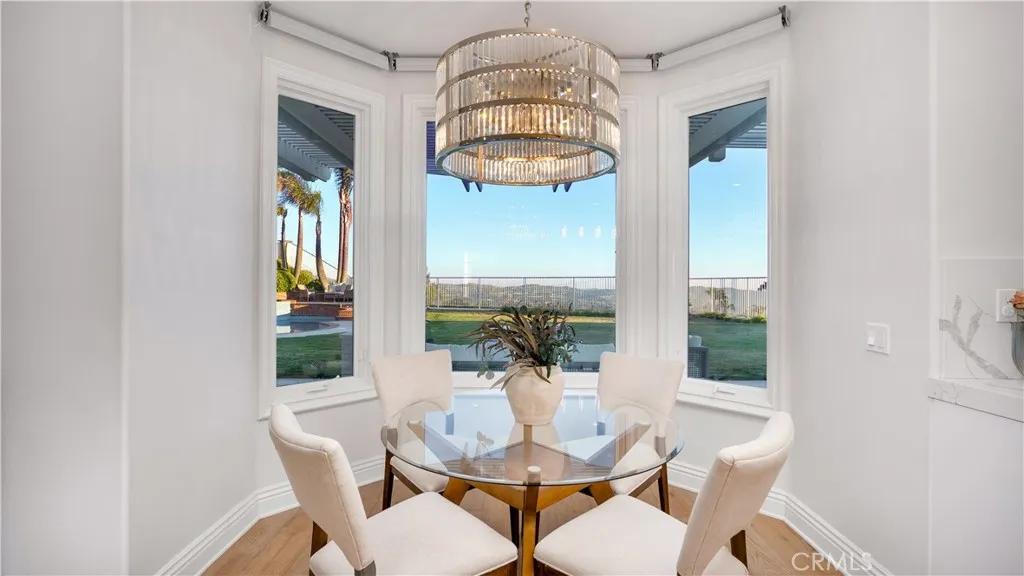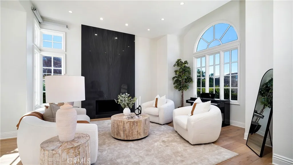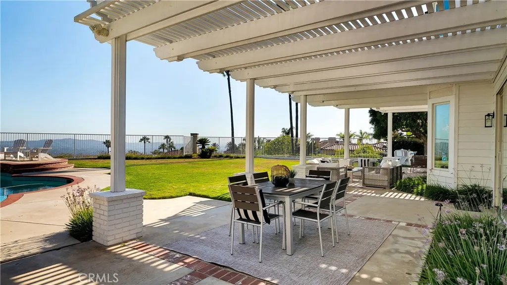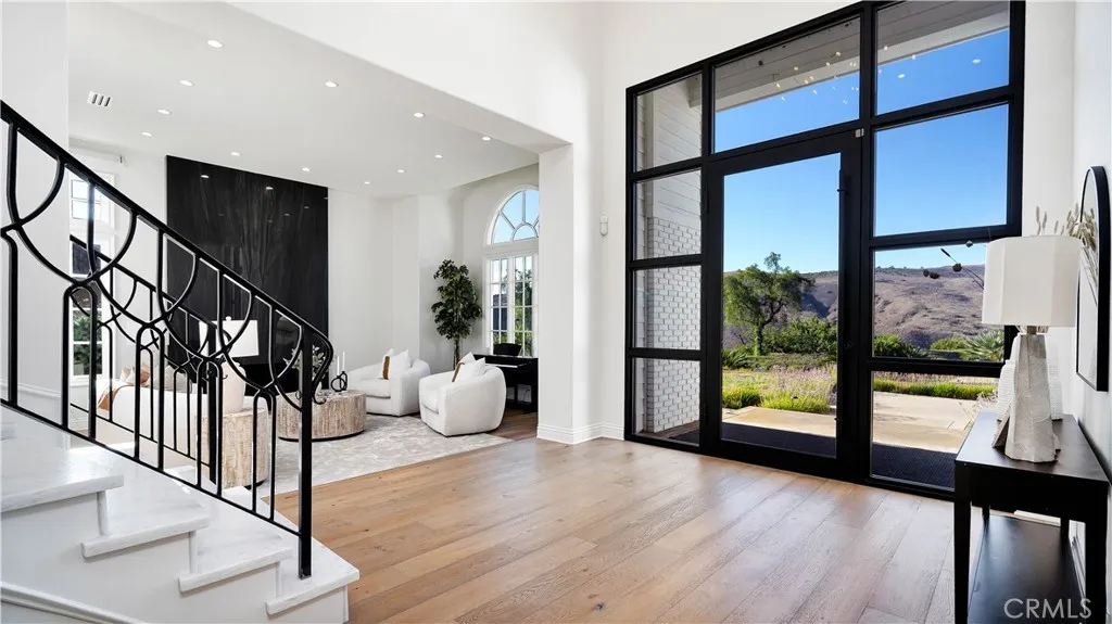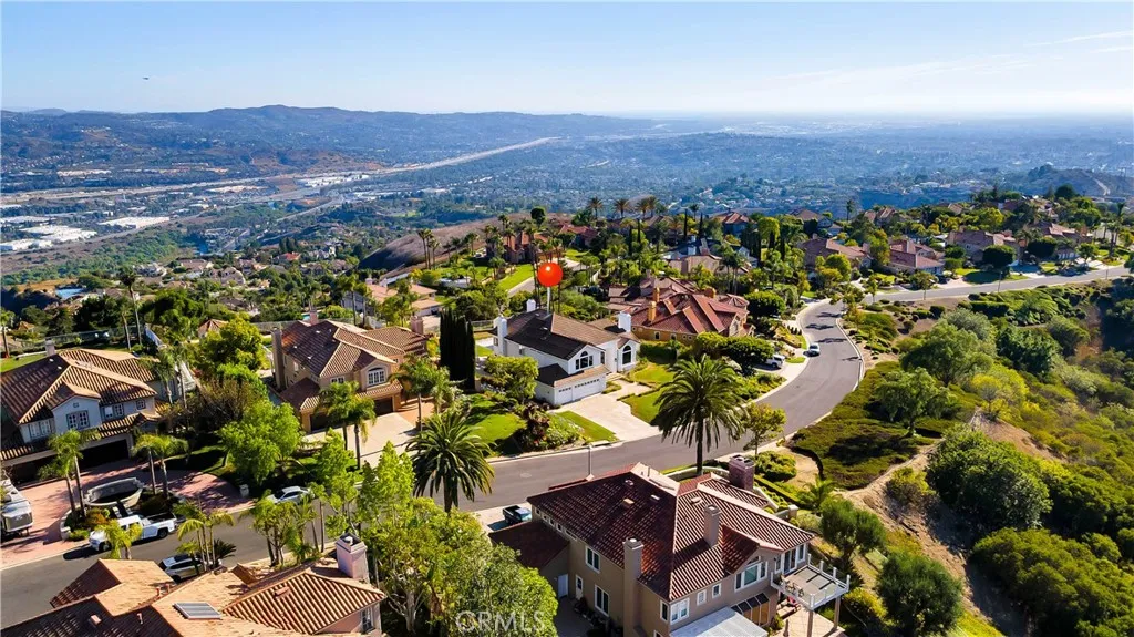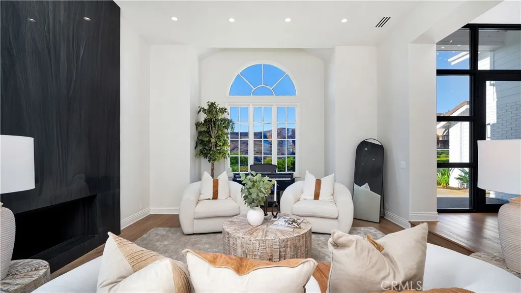 Perched at the top of the prestigious Hidden Hills neighborhood of Yorba Linda, 4855 Green Crest Drive is a ONE-OF-A-KIND ARCHITECTURAL GEM offering PRIVACY, PANORAMIC VIEWS, AND LUXURY AT EVERY TURN. With no neighbor in front, the home captures sweeping canyon and sunset views, while the backyard opens to unobstructed city lights, creating a serene setting to unwind after a long day. From the moment you step through the custom glass entryway, you're greeted by dramatic ceilings, a contemporary chandelier, and an opal white satin marble staircase that sets the tone for the rest of the home. Natural light floods the space, while French oak hardwood floors add warmth and sophistication highlighting the seamless flow and elegant finishes throughout. The formal living room centers around a striking floor-to-ceiling quartzite fireplace, while the adjacent dining room is surrounded by picture windows that frame peaceful garden views. The heart of the home is the chef's kitchen, featuring dual-tone European-style custom cabinetry, quartz counters, and a frameless bay window that invites the outdoors in. Outfitted with SubZero and Wolf appliances, and a generous center island with waterfall counters, this kitchen is as functional as it is beautiful. Just off the kitchen, a casual dining nook and spacious family room make everyday living feel elevated. The main level also offers an ensuite bedroom, ideal for guests or multigenerational living, along with a versatile flex space perfect for a home gym or office. Upstairs, the primary suite is a true retreat with its vaulted ceilings, cozy fireplace, spa-like bath with large marble shower, dual sink, freestanding bathtub, and two large custom walk-in closets. Step onto the private balcony to soak in the breathtaking views, day or night. A large upstairs bonus room with canyon views and full bath offer endless possibilities, whether as an additional bedroom, media room, or playroom. Each bathroom has been thoughtfully designed with iron and marble Hudson vanities with frameless glass tiled showers. The expansive backyard is designed for unforgettable gatherings, with multiple entertaining and dining areas, a large pool and spa, BBQ island, and postcard-worthy views in every direction. Additional features include a PAID 52-panel solar system, EV charging, motorized shades, designer lighting, modern HVAC vents, and 3-car garage. This is not just a home, it's a statement of timeless design, comfort, and California luxury.