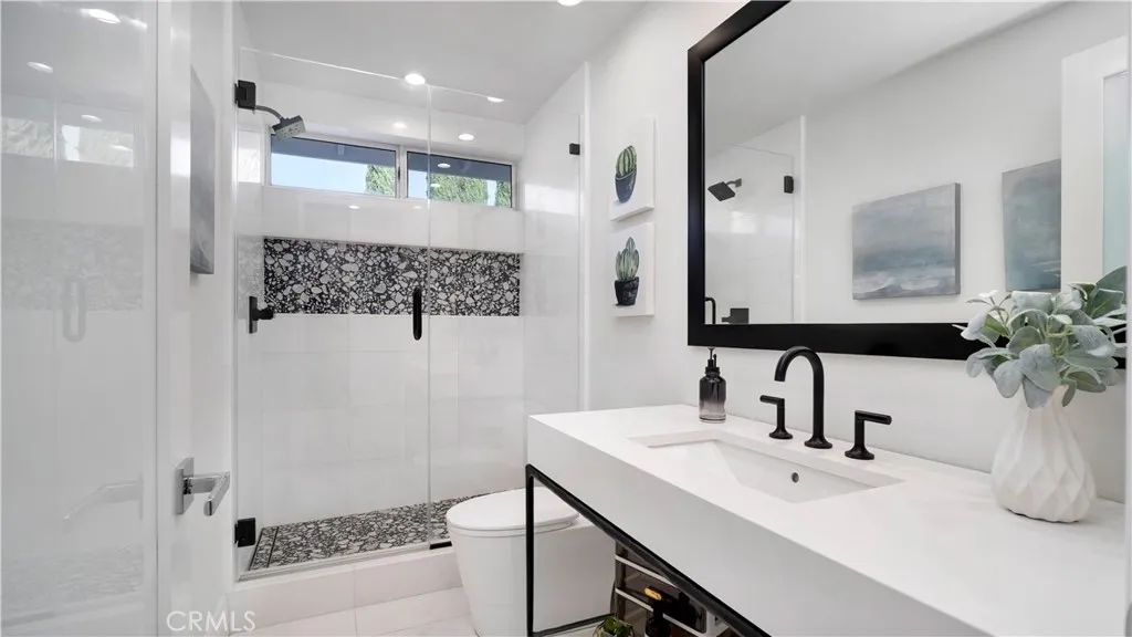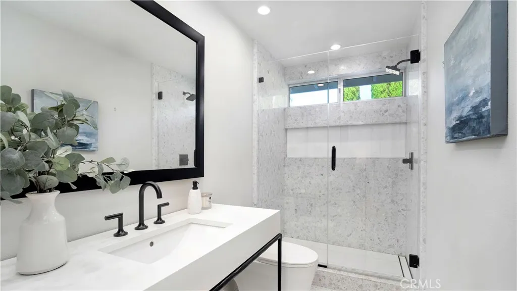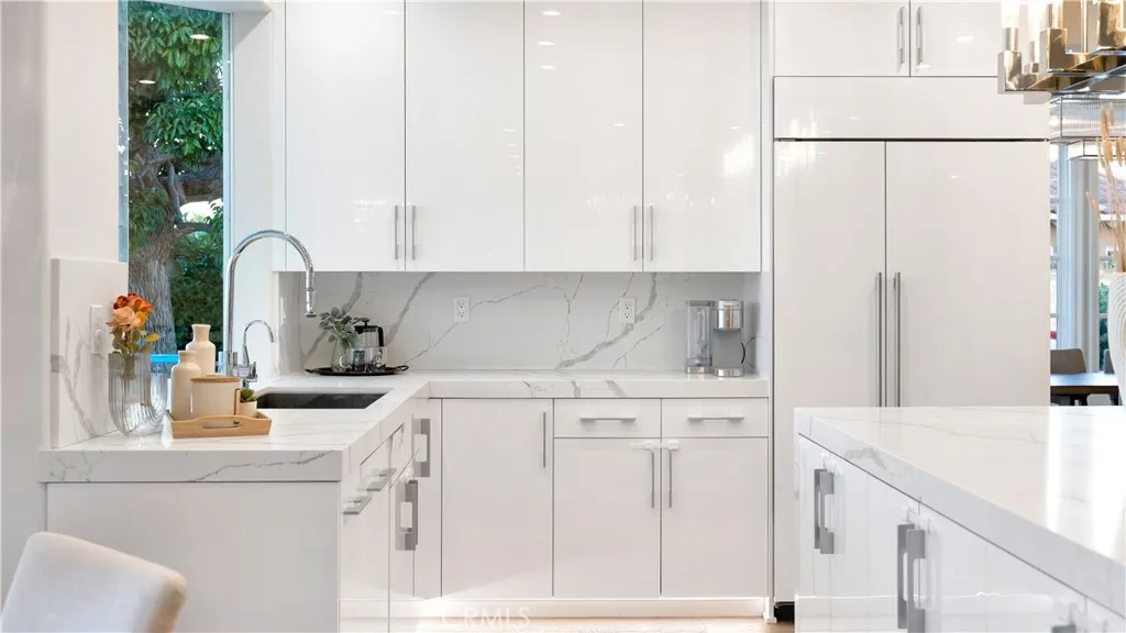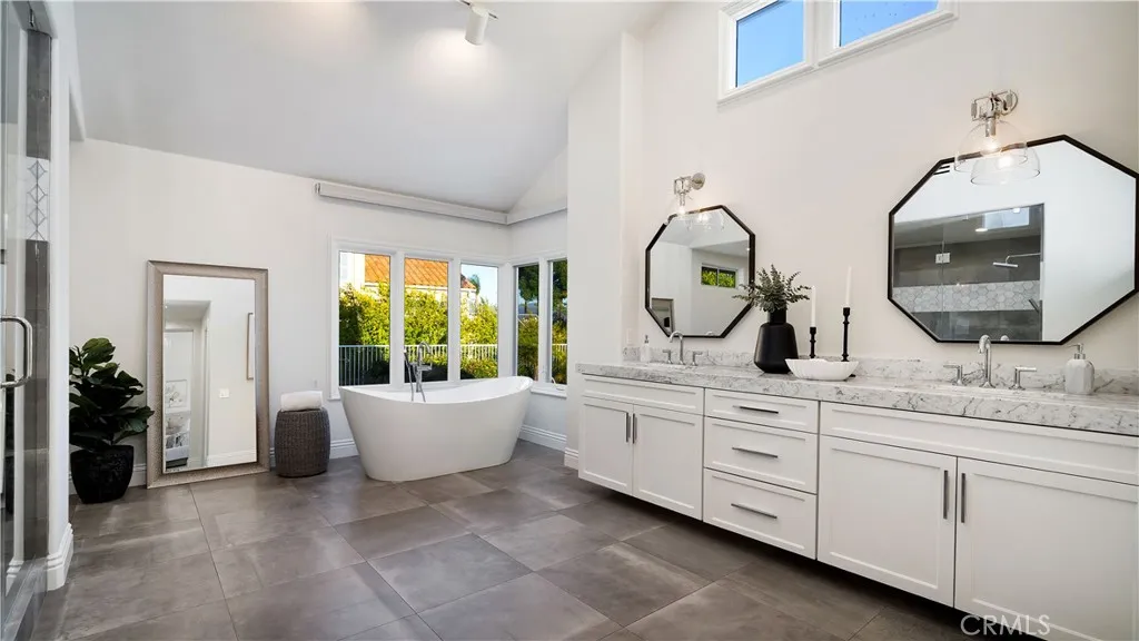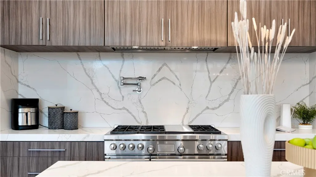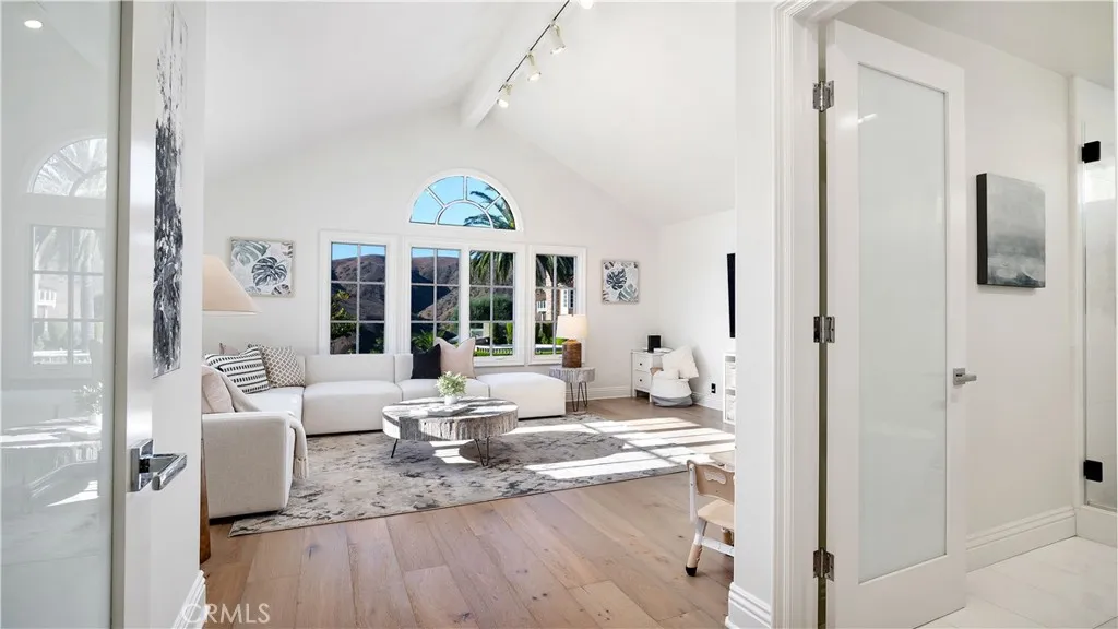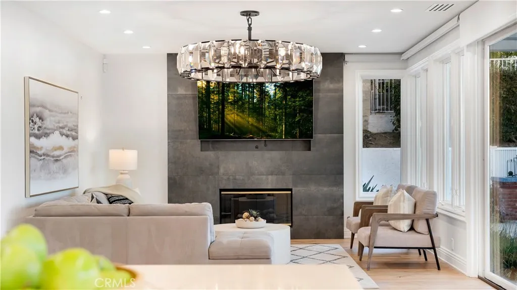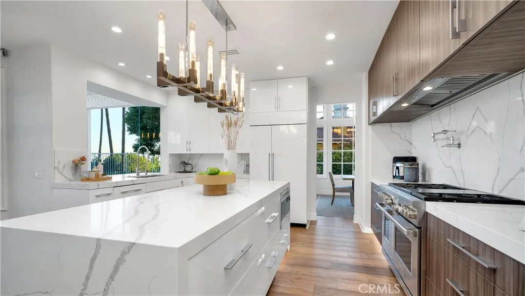 Perched at the top of the prestigious Hidden Hills neighborhood of Yorba Linda, 4855 Green Crest Drive is a ONE-OF-A-KIND ARCHITECTURAL GEM offering PRIVACY, PANORAMIC VIEWS, AND LUXURY AT EVERY TURN. With no neighbor in front, the home captures sweeping canyon and sunset views, while the backyard opens to unobstructed city lights, creating a serene setting to unwind after a long day. From the moment you step through the custom glass entryway, you're greeted by dramatic ceilings, a contemporary chandelier, and an opal white satin marble staircase that sets the tone for the rest of the home. Natural light floods the space, while French oak hardwood floors add warmth and sophistication highlighting the seamless flow and elegant finishes throughout. The formal living room centers around a striking floor-to-ceiling quartzite fireplace, while the adjacent dining room is surrounded by picture windows that frame peaceful garden views. The heart of the home is the chef's kitchen, featuring dual-tone European-style custom cabinetry, quartz counters, and a frameless bay window that invites the outdoors in. Outfitted with SubZero and Wolf appliances, and a generous center island with waterfall counters, this kitchen is as functional as it is beautiful. Just off the kitchen, a casual dining nook and spacious family room make everyday living feel elevated. The main level also offers an ensuite bedroom, ideal for guests or multigenerational living, along with a versatile flex space perfect for a home gym or office. Upstairs, the primary suite is a true retreat with its vaulted ceilings, cozy fireplace, spa-like bath with large marble shower, dual sink, freestanding bathtub, and two large custom walk-in closets. Step onto the private balcony to soak in the breathtaking views, day or night. A large upstairs bonus room with canyon views and full bath offer endless possibilities, whether as an additional bedroom, media room, or playroom. Each bathroom has been thoughtfully designed with iron and marble Hudson vanities with frameless glass tiled showers. The expansive backyard is designed for unforgettable gatherings, with multiple entertaining and dining areas, a large pool and spa, BBQ island, and postcard-worthy views in every direction. Additional features include a PAID 52-panel solar system, EV charging, motorized shades, designer lighting, modern HVAC vents, and 3-car garage. This is not just a home, it's a statement of timeless design, comfort, and California luxury.