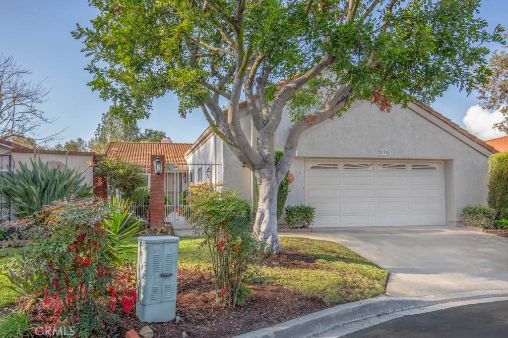 Welcome to 5174 Calzado - a single-level detached three-bedroom, two-bath VILLA SERENA residence in the sought-after Gate 11 neighborhood of the Laguna Woods senior community. Situated at the end of a quiet cul-de-sac, this home is far from busy roads and noisy highways. With attractive curb appeal, this property boasts a large front courtyard with fruit trees surrounding its perimeter. This courtyard is perfect for outdoor entertaining, dining and relaxing with family and friends. The enormous living room easily accommodates large furnishings and features a cathedral ceiling with wood beams and wood-burning fireplace. Glass sliders in both the living room and primary bedroom open to a covered rear patio extending the length of the house. The rear patio measuring over 350 sq. ft. is ideal for year-round outdoor enjoyment. The kitchen has ample storage cabinets and counter space and features a cozy breakfast nook area. The kitchen garden window has a lovely view of the front courtyard. The primary bedroom suite also has an impressive cathedral ceiling and an en suite bathroom with dual sinks and a shower-tub combo. Either of the two guest bedrooms could serve as a home office, arts and crafts workshop, exercise studio or sewing room. One of the guest bedrooms looks onto the front courtyard. The massive garage easily accommodates two vehicles plus golf cart with additional driveway parking for two more vehicles. There is also ample street parking for guests. Washer/dryer hookups and a utility sink are conveniently located in the garage. This property is largely original and a tremendous opportunity for a new owner to upgrade or remodel. Do not miss this special property!
