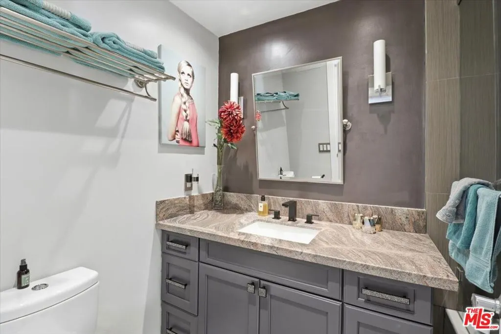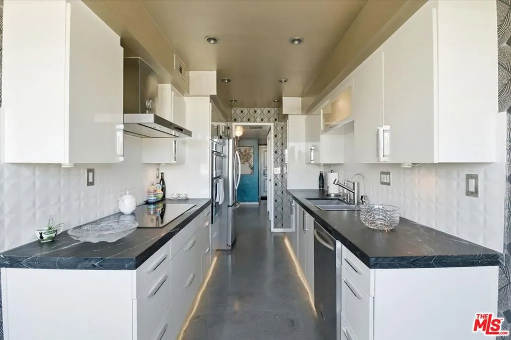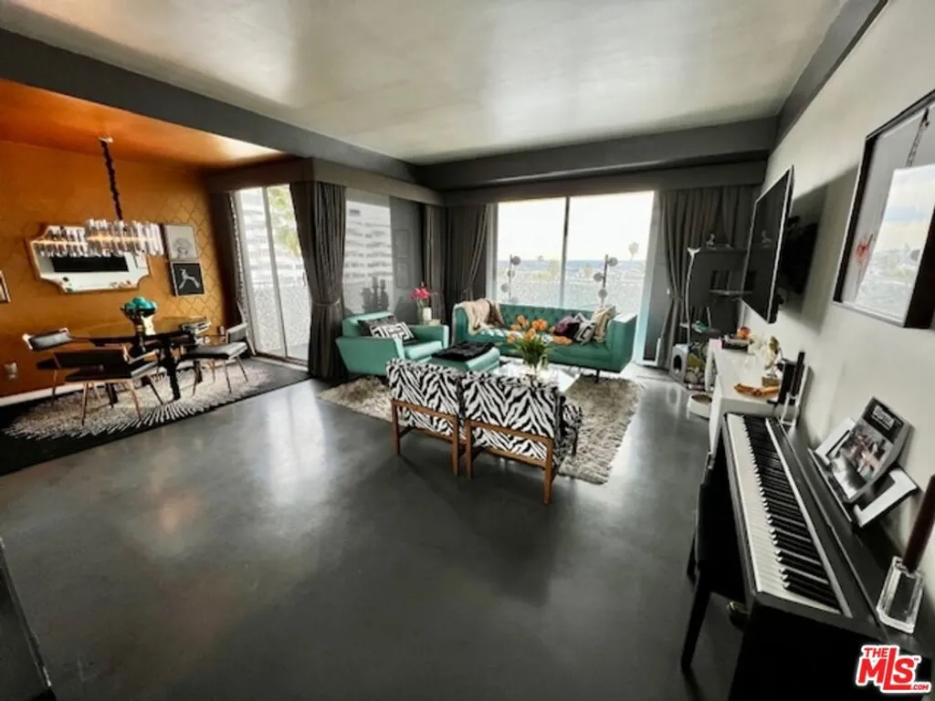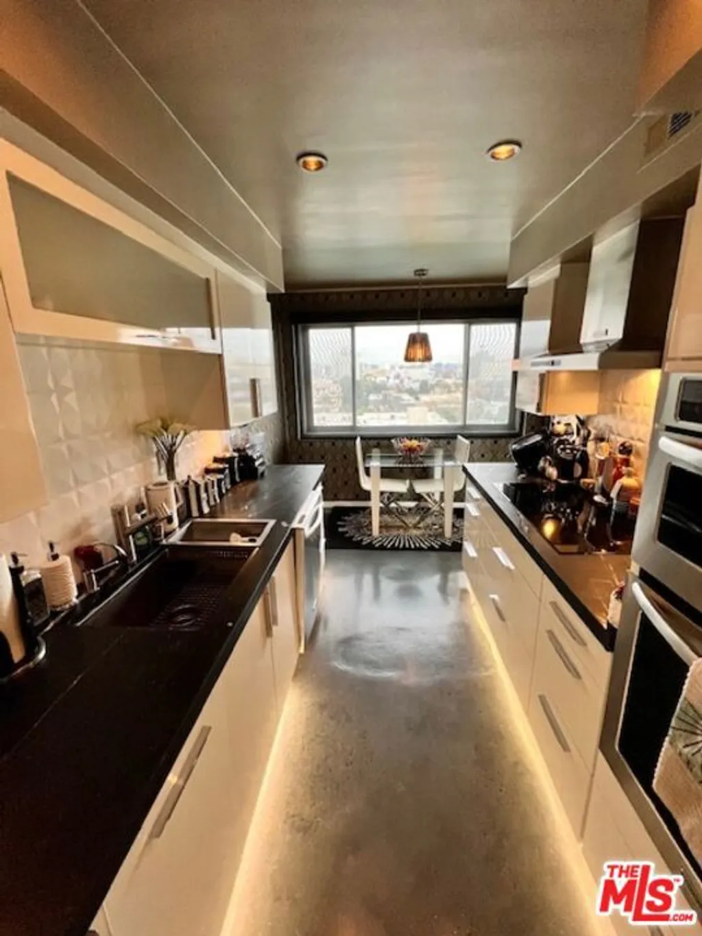 Perched on the fifth floor of the sought-after Franklin Towers at 7250 Franklin Ave #517, this renovated corner residence offers 2 bedrooms and 2 bathrooms with sweeping views of the Los Angeles skyline. The generous wraparound terrace showcases dramatic city vistas and spectacular sunset displays. Meticulously upgraded throughout, this contemporary home features concrete and hardwood floors, designer wallpaper accents, and a custom mirrored wall that enhances the sophisticated aesthetic. The designer kitchen is outfitted with stainless steel appliances, contemporary cabinets, and black granite countertops that blend sophistication with practicality. A newly updated air-conditioning system ensures year-round comfort, while the luxurious cedar-lined walk-in closet and custom built-in closets provide abundant storage solutions. Convenience is enhanced with in-unit laundry hookups and two designated parking spots plus additional storage space. Franklin Towers delivers exceptional full-service amenities including round-the-clock concierge and security services, valet parking, a temperature-controlled pool, spa facilities, steam room, dry sauna, dedicated yoga studio, and a glass-walled rooftop fitness center offering magnificent city scape panoramas. The rooftop entertaining space and clubhouse featuring a full kitchen and comfortable lounge area create the perfect setting for gatherings. Perfectly positioned near Runyon Canyon, Hollywood Boulevard, and the Sunset Strip, this outstanding residence provides unparalleled urban luxury living.