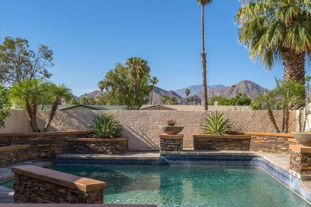 The main photo says it all- Welcome to this charming 3 bed 2 bath 1400+ sq foot single family home in the desirable non gated community of Palm Desert Country Club community. From your private, gated pool area, enjoy spectacular southern mountain views while relaxing by the built in fire pit, sunken spa or under the covered seating area on the stamped concrete patio.As you move toward the main entrance you will find a cozy outdoor dining space with convienent pass through to kitchen. Inside the living room highlighted by vaulted ceiling, full stone fireplace, oversized patio doors that open directly to the pool perfectly framing those breathtaking southern mountain views. Kitchen has been updated w/ SS appliances, granite counters & ample cabinets. Garage access comes right into the kitchen. Primary bedroom features en suite bath and private patio door leading to the back yard. The 3rd bedroom is a versatile space, also with patio access, ideal for a guest room, office, or hobby area. The spacious back yard is enhanced with a new paver patio providing even more outdoor space.Palm Desert CC Golf course is just down the street and your minutes from world-famous Indian Wells Tennis Gargen home to the BNP Paribas Tennis tournament. Shopping, groceries, access to Interstate 10 or the new Acrisure Arena, home to the Coachella Valley Firebird AHL hockey team is all just a short drive away.