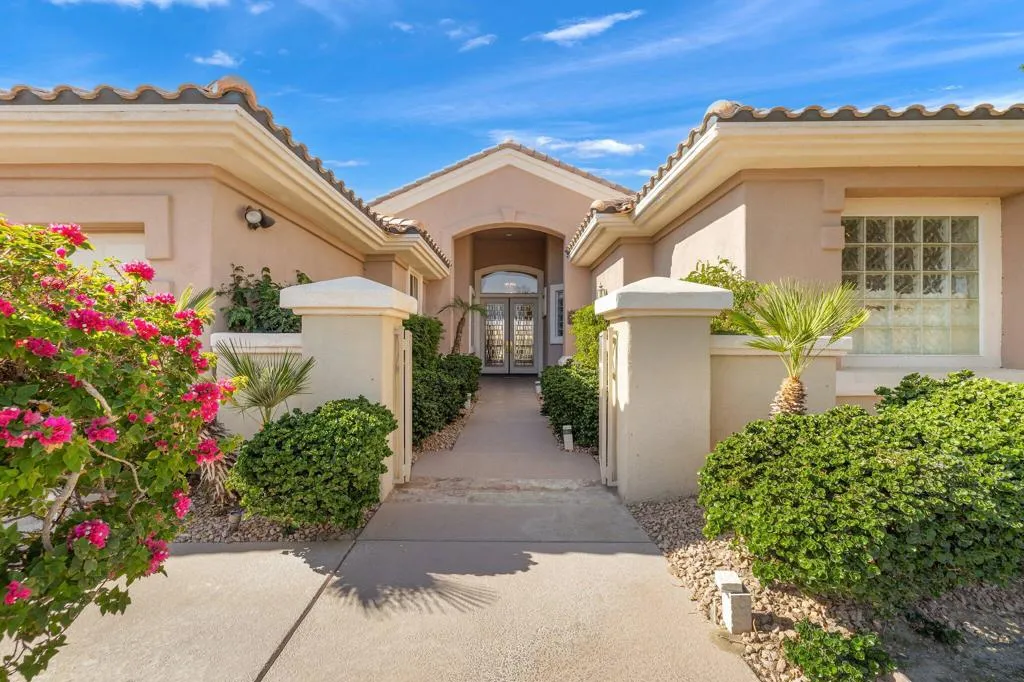 Welcome to Sun City Palm Desert, Coachella Valley's premier 55+ active adult community.This expansive Portofino model offers 2,859 sf (EST.) of sophisticated living space. Designed for both comfort and style, the home features 3 spacious bedrooms--each with its own en-suite bathroom--plus a convenient guest powder room. The bright and open layout includes a formal living and dining room, a well-appointed kitchen with center island, and a generous primary suite with direct patio access, dual vanities, soaking tub, and walk-in closet. Step outside to a beautifully landscaped backyard that opens directly onto the golf course, creating a serene setting with unobstructed views. The private SPOOL is the perfect place to relax or entertain while watching the sun set over the fairway with northern exposure. Sun City offers an unmatched lifestyle with two championship golf courses, multiple clubhouses with dining, fitness centers, pools, spas, tennis and pickleball courts, bocce ball, scenic walking trails, and over 80 clubs and activities. Residents also enjoy 24-hour guard-gated security and meticulously maintained grounds. This move-in ready home includes spool and landscape maintenance, making it effortless to enjoy one of the most desirable communities in the desert. Items included: patio furniture, washer/dryer. refrigerator, standing freezer, golf cart and bbq.